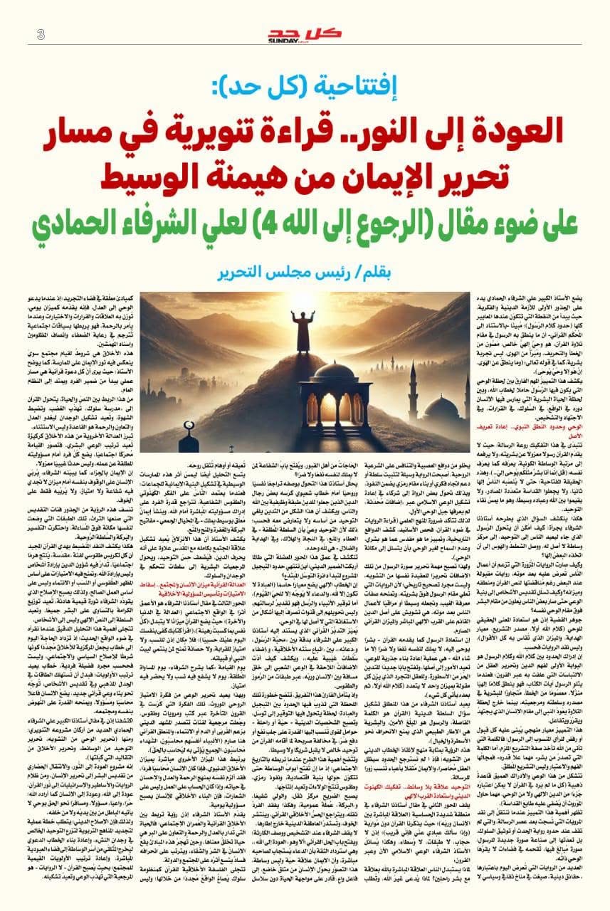 ويركز الشرفاء الحمادي في مقاله على أن الرجوع إلى الله لا يتحقق بالشعارات أو الطقوس المجردة وإنما بالعودة إلى القيم القرآنية الكبرى : العدل والرحمة والحرية والمسؤولية الفردية مؤكداً أن الانحراف عن التوحيد بدأ حين جرى استبدال النص الإلهي بتفسيرات بشرية تحولت مع الزمن إلى سلطة مقدسة وأفرغت الدين من مقاصده الأخلاقية والإنسانية .