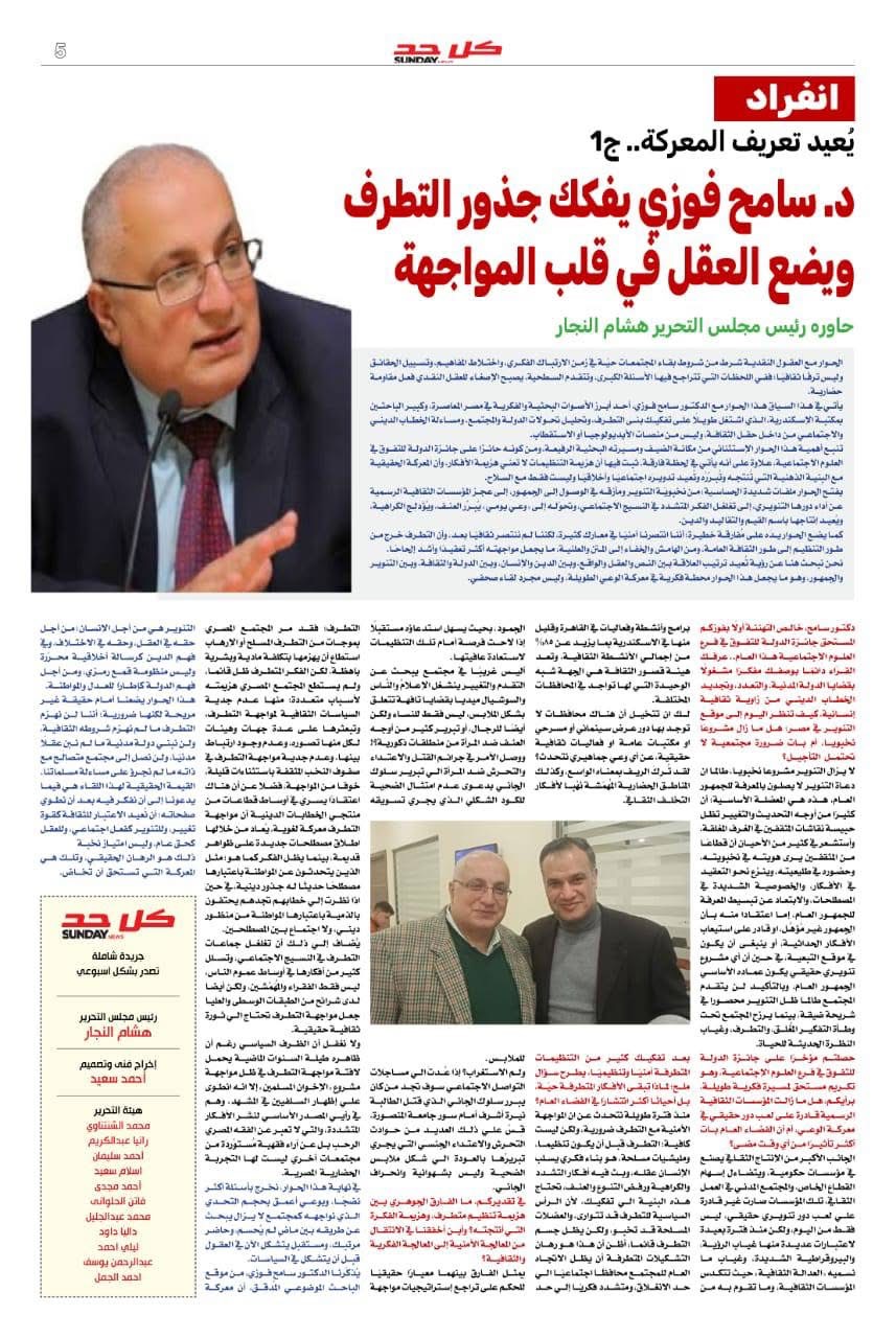 وانفرد العدد بلقاء استثنائي مع الأكاديمي والباحث المرموق الدكتور سامح فوزي كبير الباحثين بمكتبة الإسكندرية وذلك بمناسبة فوزه هذا العام بجائزة الدولة للتفوق في فرع العلوم الاجتماعية حيث يتناول الحوار رؤيته لقضايا التنوير والتجديد الديني والمجتمع المدني .