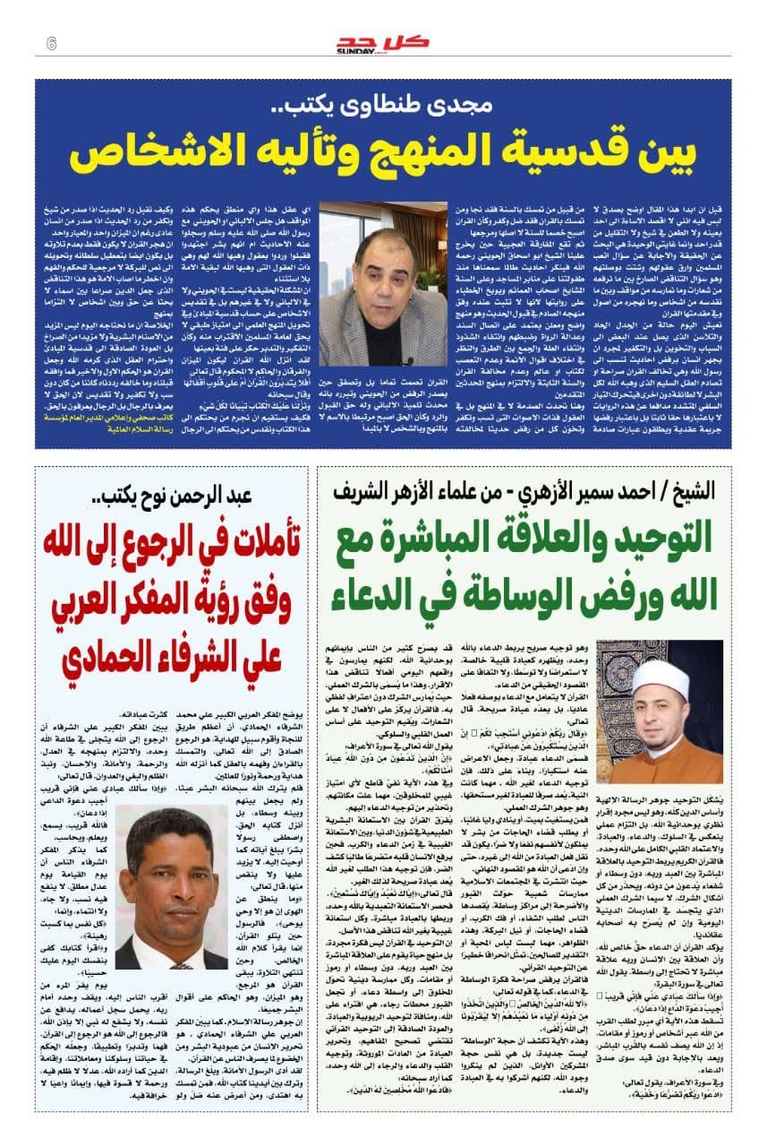 وفي السياق نفسه يضم العدد مقال مهم للكاتب الصحفي مجدي طنطاوي المدير العام لمؤسسة رسالة السلام العالمية بعنوان " بين قدسية المنهج وتأليه الأشخاص " يناقش فيه الخلل العميق الذي أصاب الخطاب الديني حين انتقلت القداسة من القيم والمبادئ إلى الأفراد .