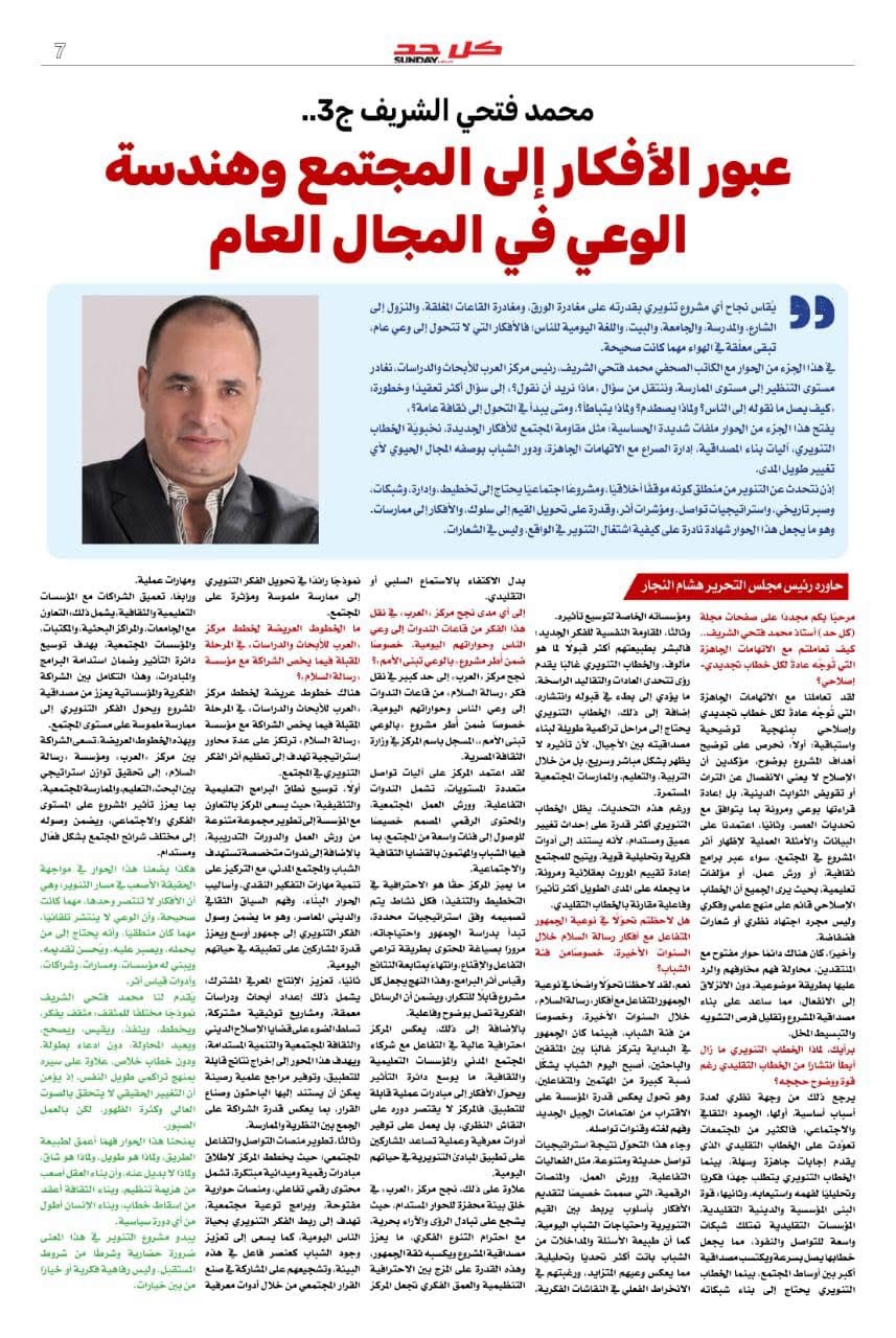 كما تواصل المجلة نشر أجزاء الحوار مع الكاتب الصحفي محمد فتحي الشريف رئيس مركز العرب للدراسات والأبحاث ويأتي في هذا العدد الجزء الثالث من الحوار متناولًا تحولات المشهد الإعلامي والفكري في العالم العربي .