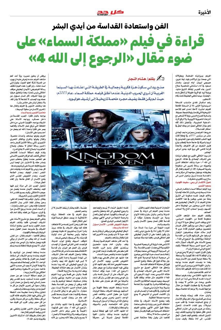 وفي الصفحة الأخيرة التي تشتبك مع المشهد الفني والثقافي يقدم رئيس مجلس تحرير المجلة الكاتب الصحفي هشام النجار مقال تحليلي نقدي بعنوان " الفن واستعادة القداسة من أيدي البشر " متخذ من فيلم " مملكة السماء " مدخل لقراءة فكرية على ضوء أفكار علي الشرفاء الحمادي حول التوحيد ونزع القداسة عن العنف .