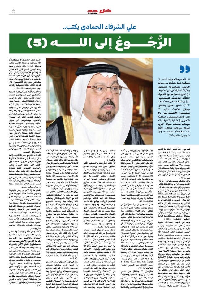 ويحتل مقال الأستاذ علي الشرفاء الحمادي بعنوان " الرجوع إلى الله 5 " مساحة بارزة في هذا العدد، وهو الجزء الخامس والأخير من مقدمة كتابه " ومضات على الطريق الجزء الثامن " حيث يسلط الضوء على أهمية العودة إلى الله كمنهج للحياة وإعادة بناء العقل البشري من منظور إيماني متوازن مسلطاً الضوء على الرسائل الجوهرية التي تجمع بين التنوير الروحي واليقظة العقلية .