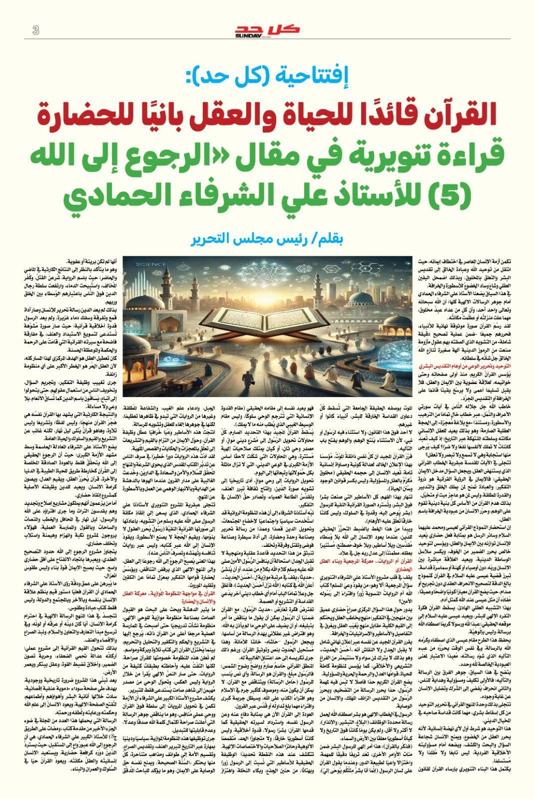 صدر امس العدد الجديد من مجلة " كل حد " الصادرة عن مؤسسة " رسالة السلام " العالمية بمانشيت رئيسي " العقل يتحرر والقرآن يقود " ليقدم ملف رئيسي غني بالتحليل المعمّق والرؤية التنويرية حول العلاقة بين العقل والروحانية في الحياة المعاصرة.