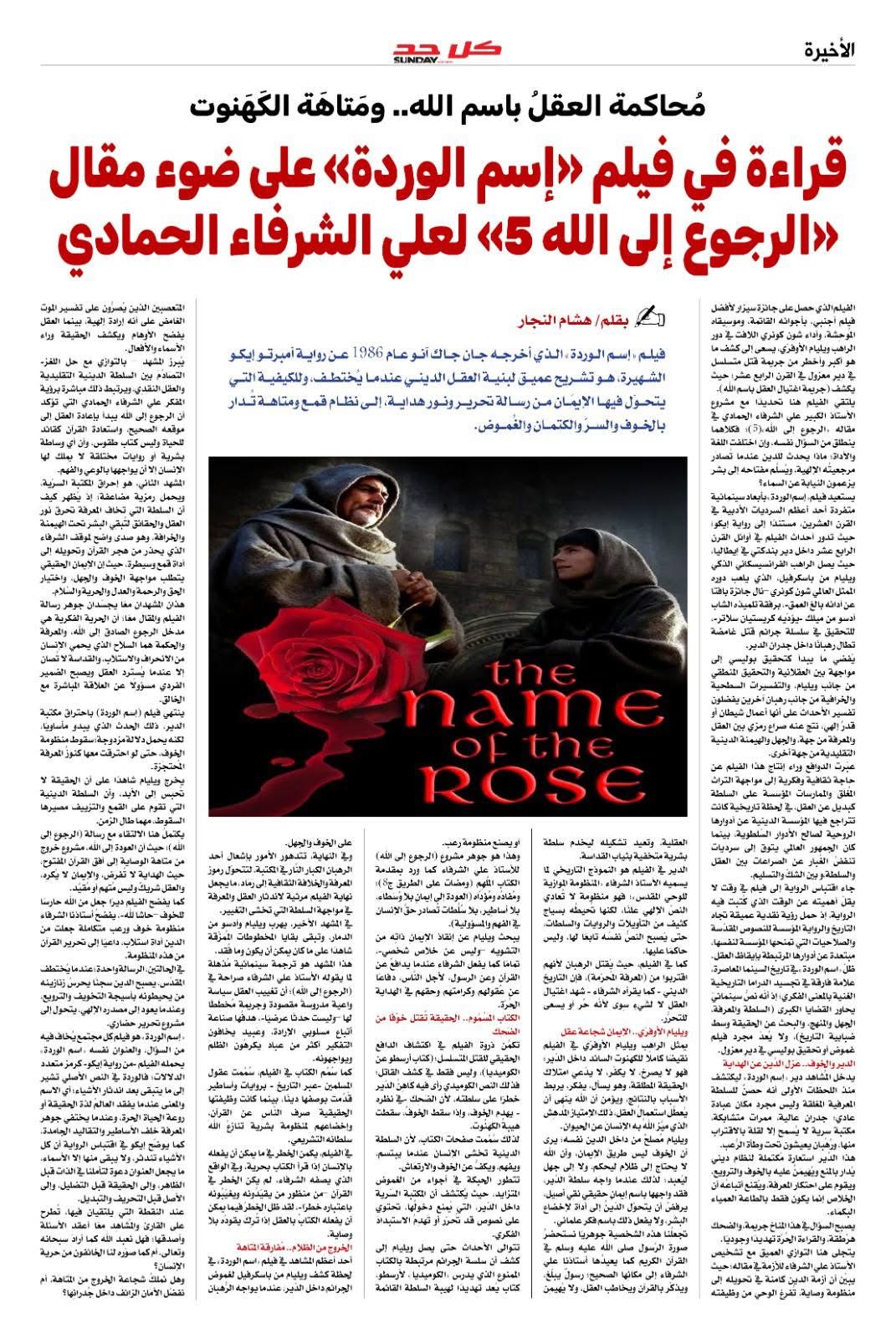 ويختم العدد بمقال نقدي وتحليلي بعنوان " محاكمة العقل باسم الله ومتاهة الكهنوت .. قراءة في فيلم اسم الوردة على ضوء مقال الرجوع إلى الله 5 " للكاتب الصحفي هشام النجار والذي يستعرض التوتر بين العقل والدين في التاريخ والثقافة المعاصرة مستفيداً من أفكار الشرفاء الحمادي .