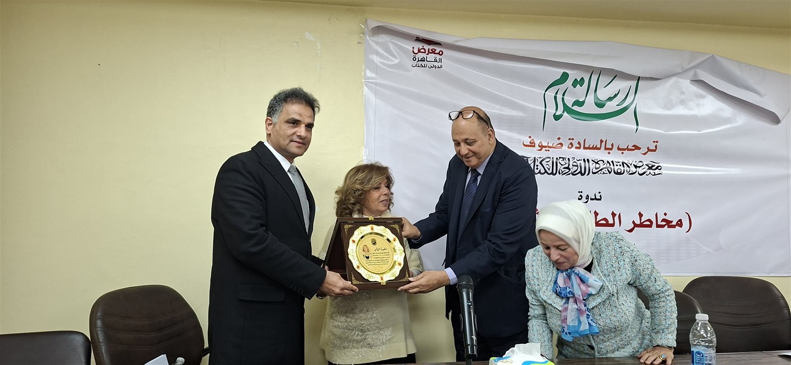 وقام بتسليم درع التكريم كل من الدكتور معتز صلاح الدين، رئيس مجلس أمناء مؤسسة رسالة السلام بالقاهرة، والدكتور عبد الراضي رضوان، نائب رئيس المؤسسة وعميد كلية دار العلوم الأسبق، وذلك بحضور نخبة من المثقفين والباحثين والإعلاميين .