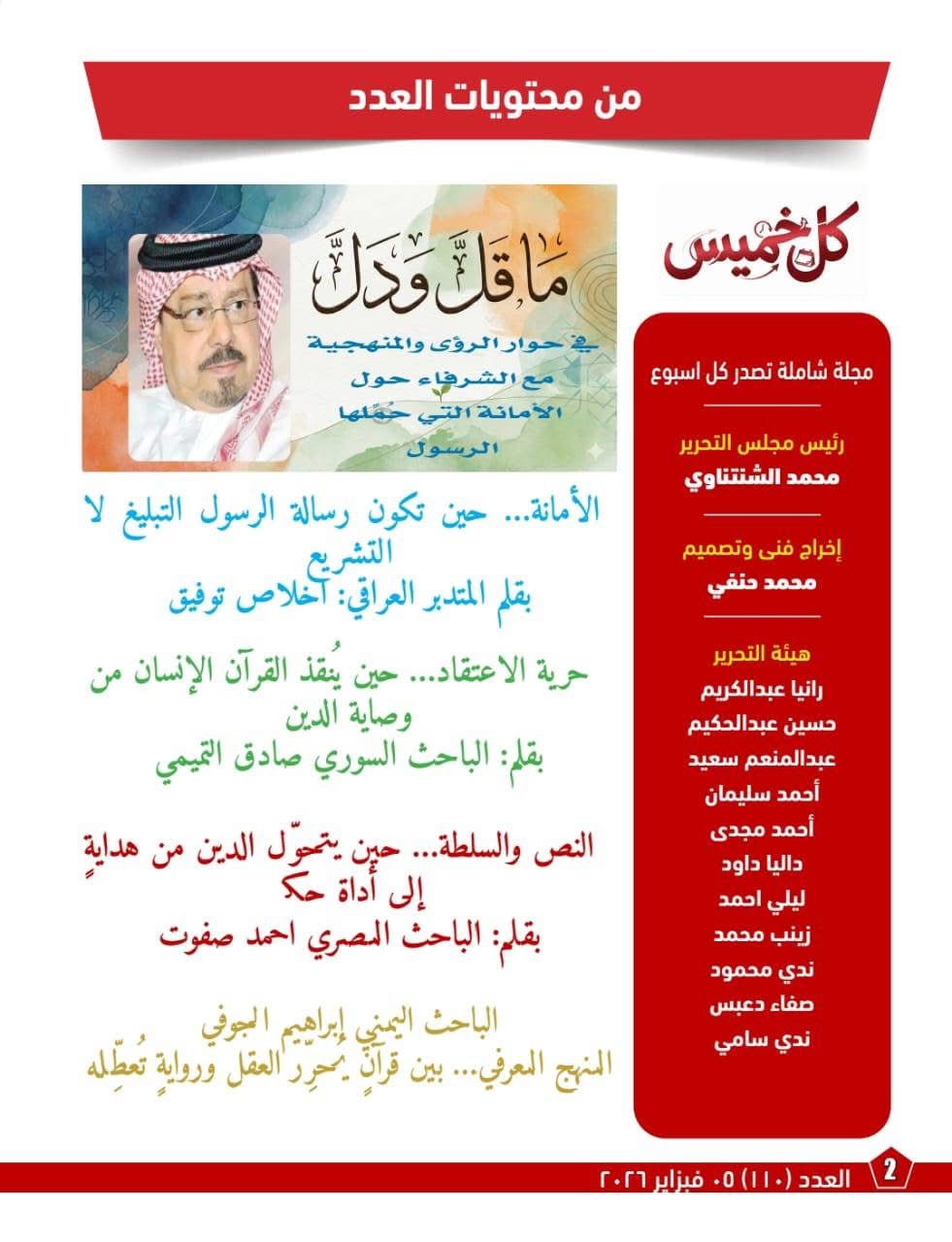 الجدير بالذكر ان مجلة " كل خميس " يشرف على تحريرها الكاتب والباحث محمد الشنتناوي ويأتي هذا العدد كامتداد لرؤية فكرية متكاملة تهدف إلى تعزيز النقاش الإصلاحي في المجال الثقافي ومراجعة العلاقة بين النص القرآني والروايات والتقاليد التي أعقبتها .