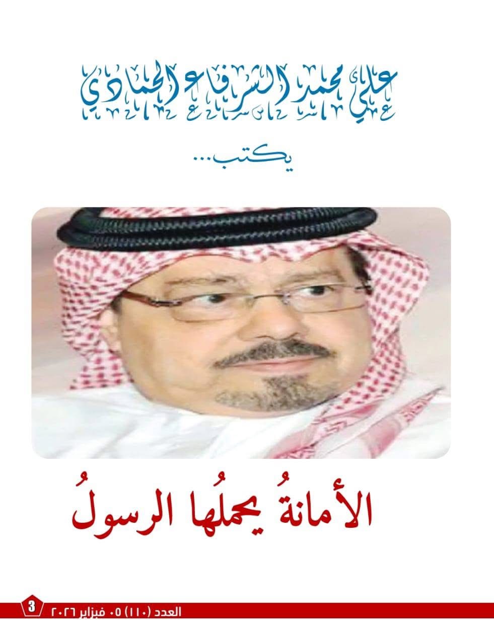وافتتحت المجلة عددها بمقال للشرفاء الحمادي بعنوان : " الأمانة يحملها الرسول " وجاء فيه الطرح الإصلاحي الذي يركز على إعادة الاعتبار للمنهج القرآني كمنهج معرفي متكامل ويؤكد المقال علي أن القرآن هو المصدر الوحيد للتشريع والهداية وأن التدبر يمثل أداة الفهم في حين يظل العقل شريك أساسي في المسؤولية الدينية .