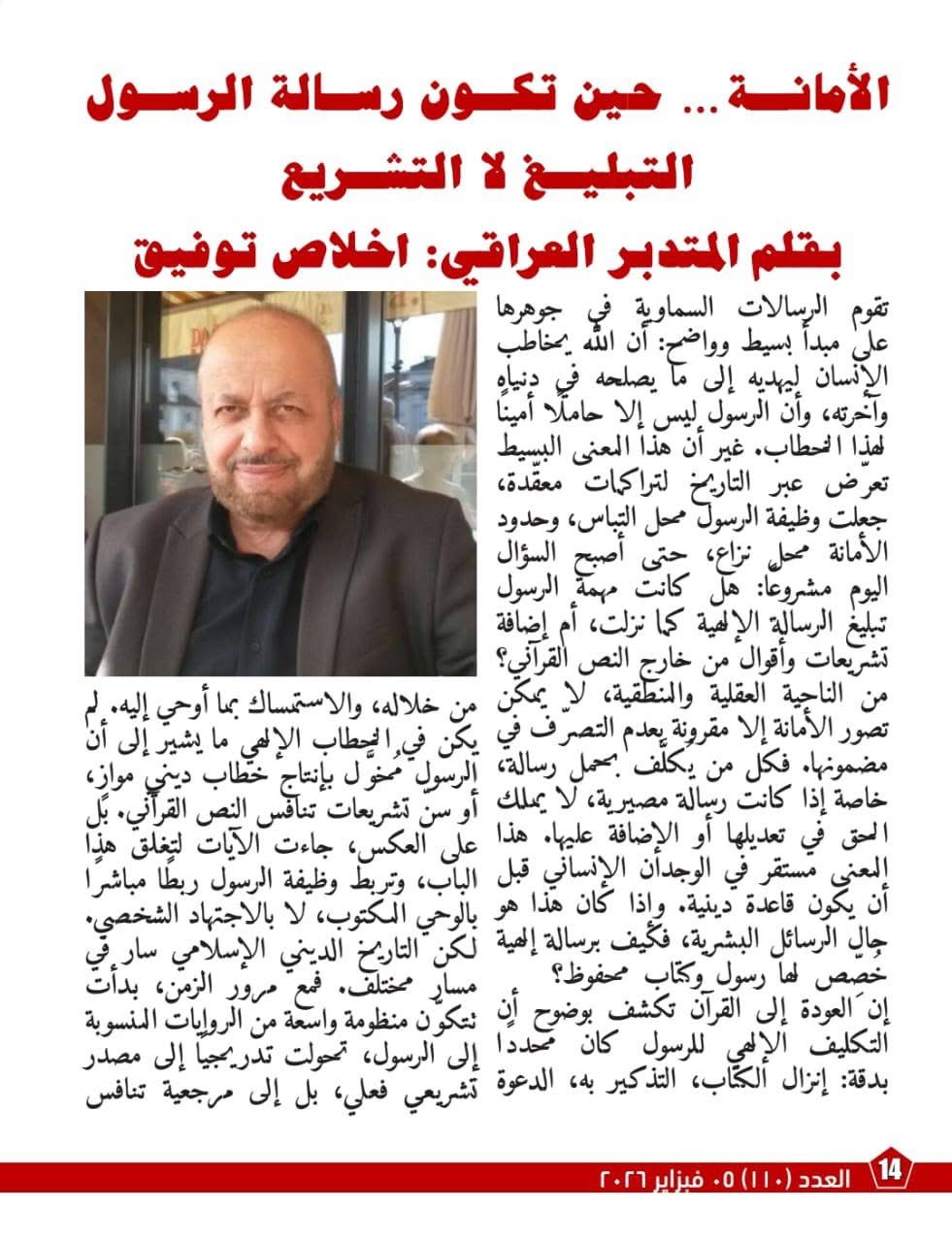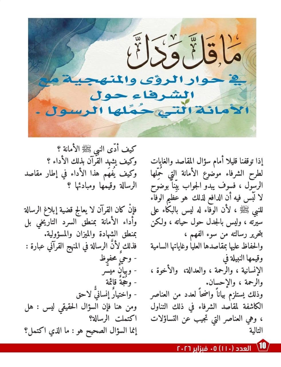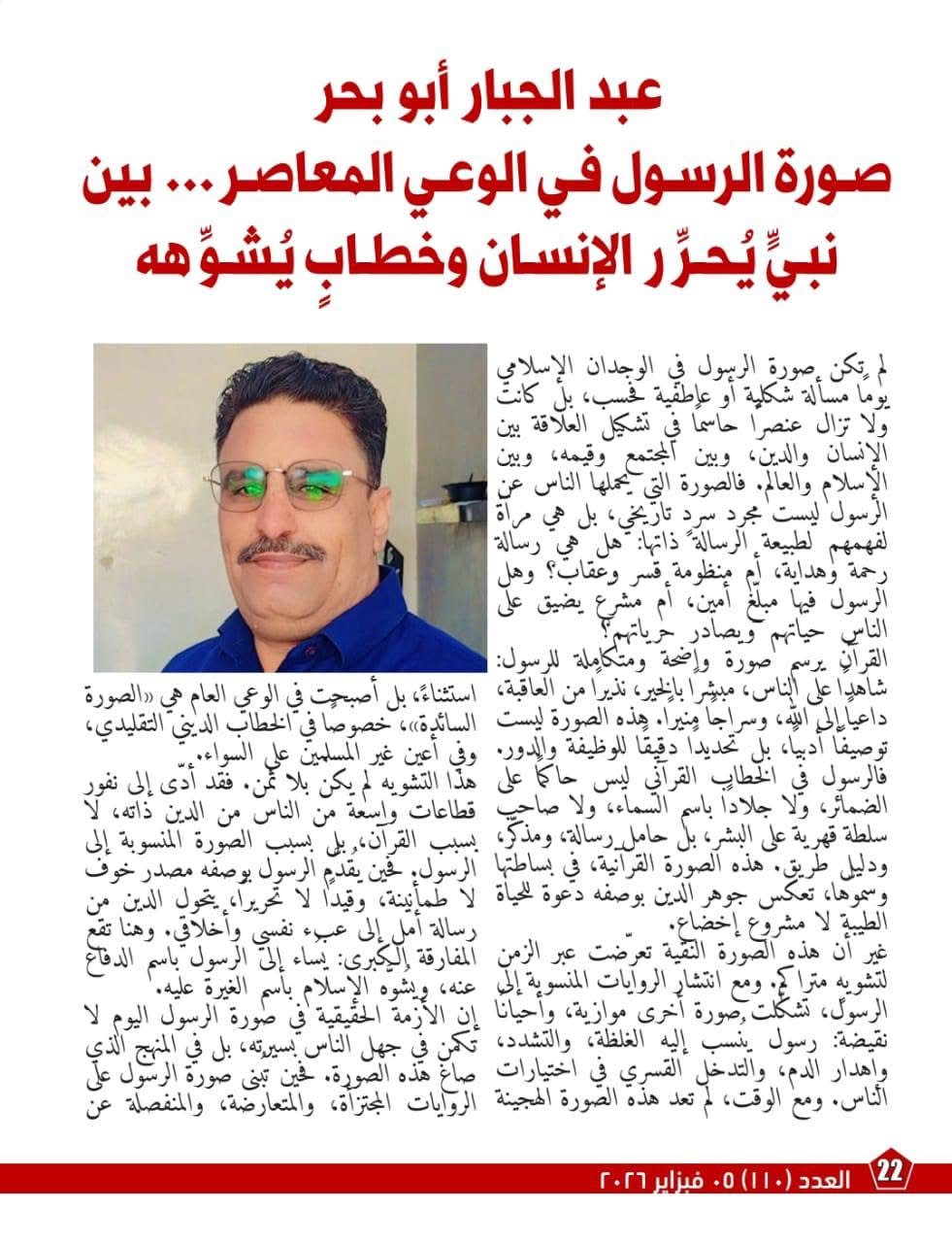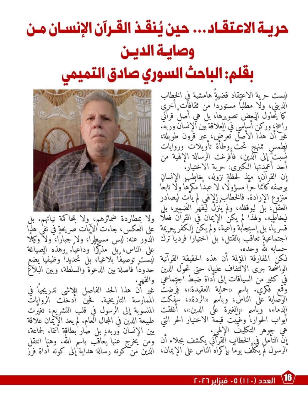 كما ركز العدد على إعادة قراءة صورة الرسول الكريم في الوعي المعاصر معتبرين أن مراجعة التاريخ في ضوء النص القرآني تمثل دفاع عن العقل والقيم الإنسانية مثل العدل والرحمة والحرية وكرامة الإنسان مشددين على أن الدين القائم على الأمانة لا يمكن أن يبرر الظلم أو الإقصاء باسم الله .