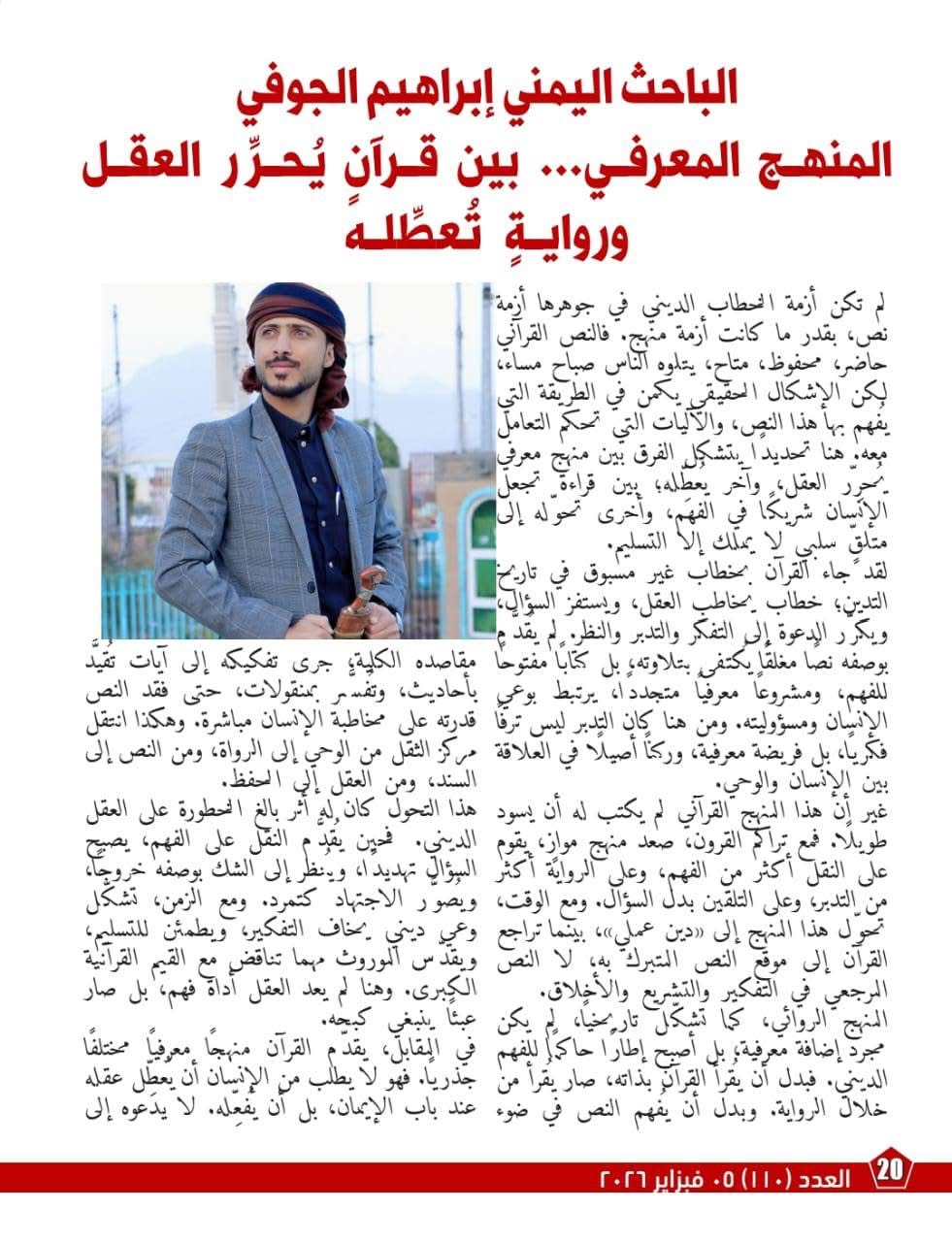وتتواصل في صفحات العدد مقالات تحليلية أخرى تبحث انعكاسات تغييب المنهج القرآني في الواقع المعاصر مثل انتشار التطرف تضارب الفتاوى وتوظيف الدين في تبرير العنف وتشير هذه المقالات إلى أن تجاوز النص القرآني لصالح الرواية أدى إلى تشوهات معرفية وأخلاقية ما يستدعي إعادة بناء المنهج من جذوره وفق مقاصد كبرى كالعدل والرحمة والحرية وكرامة الإنسان .