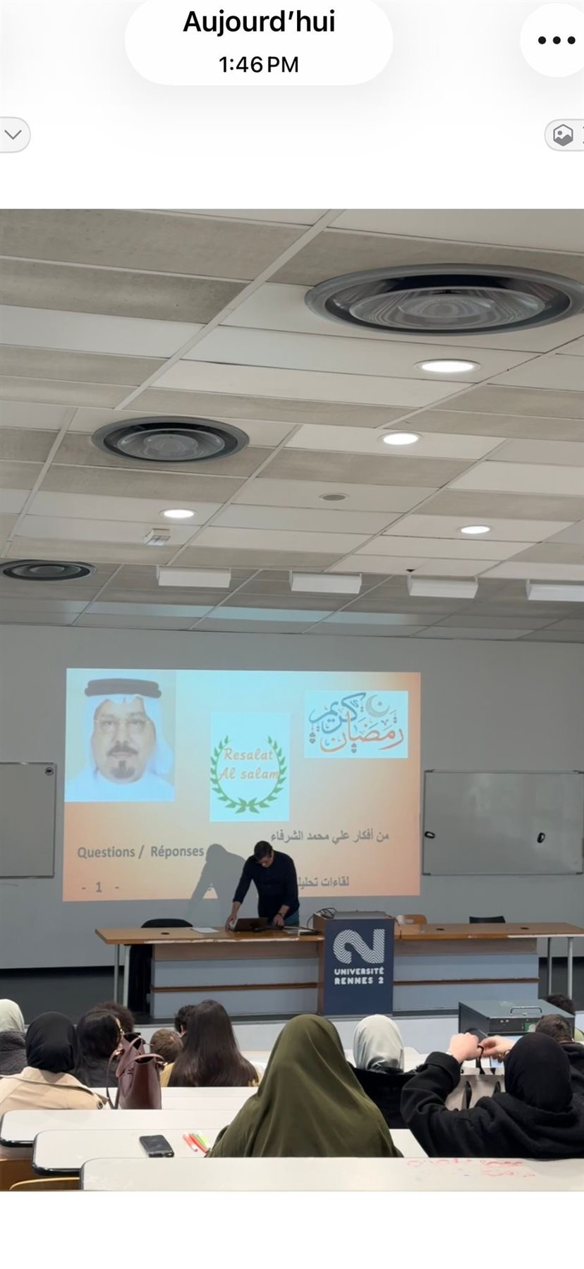 احتفالا بحلول شهر رمضان المبارك، نظم الدكتور شكرى الميموني، رئيس قسم الدراسات العربية بجامعة رين الفرنسية وممثل مؤسسة رسالة السلام بفرنسا لقاء مفتوحا للتعريف بفضائل الإسلام وسماحة القرآن الكريم، وذلك بحضور عدد من الطلاب والطالبات المهتمين بالحوار الثقافي والديني.