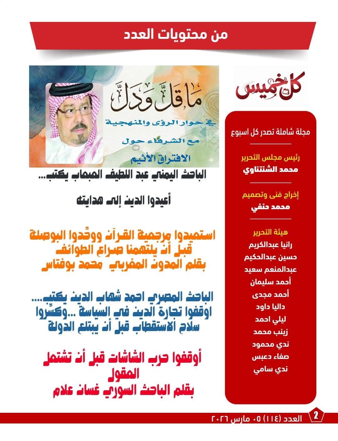 وبهذا البناء المتدرج، يقدم العدد الجديد من «كل خميس» ملفاً فكرياً متماسكاً يعيد طرح سؤال الوحدة بوصفه قضية منهج ومرجعية ومعيار أخلاقي، لا مجرد خطاب تعبوي؛ قرآن جامع، وعدل يحمي الإنسان، ووعي يحاصر الاستقطاب، وتعليم يصنع مناعة ضد توريث الكراهية.