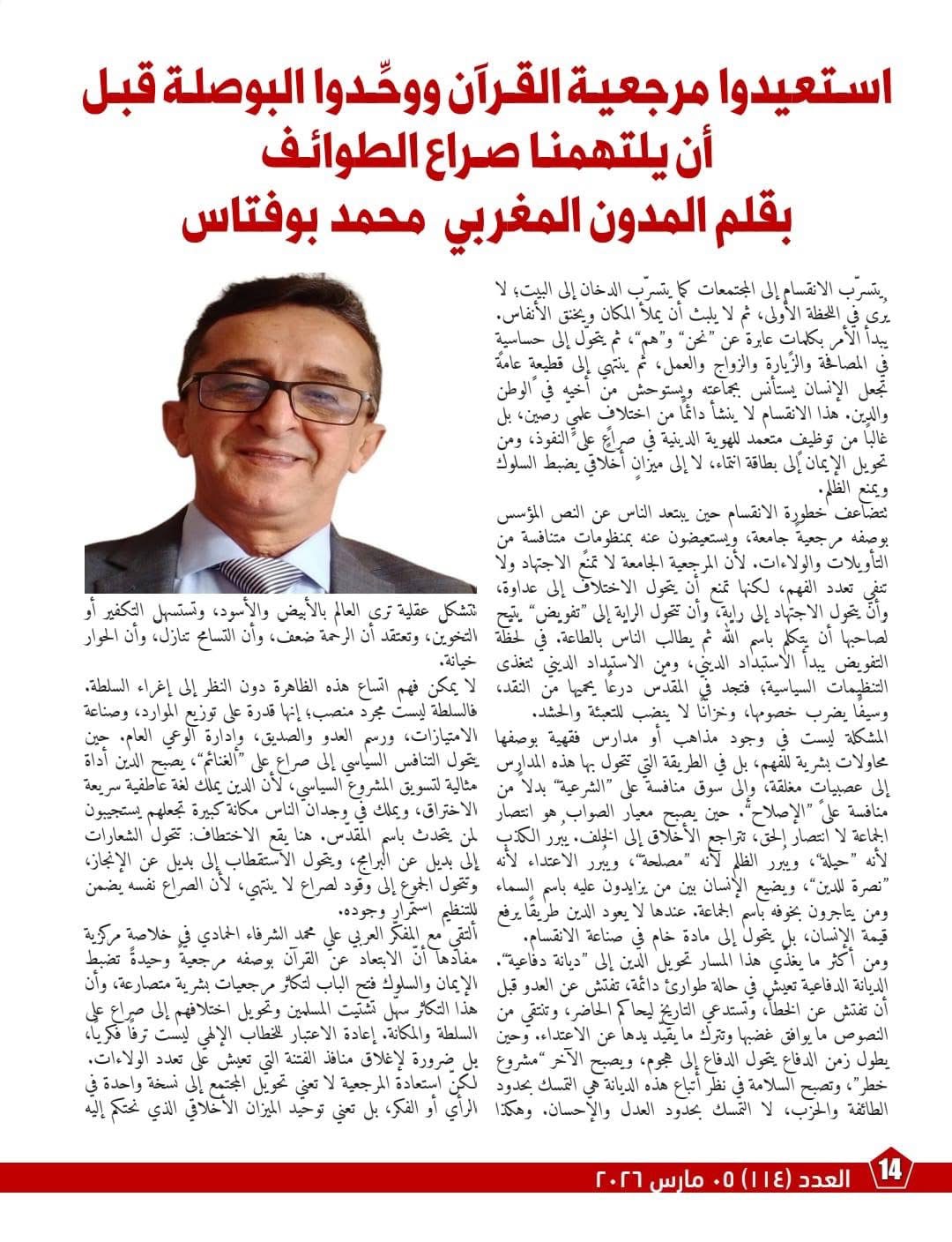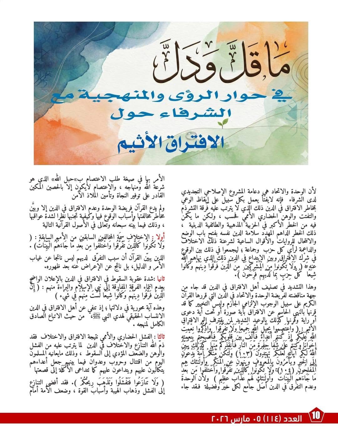 ويطرح الشرفاء في مقاله الافتتاحي أطروحته الإصلاحية في قلب السؤال المعاصر: كيف أُبعد المسلمون عن مرجعية القرآن الجامعة، واستُبدلت بها مرجعيات متنازعة أفضت إلى الانقسام والتسييس والصراع. ويؤكد أن وحدة المسلمين ليست شعاراً سياسياً، بل فريضة قرآنية تقوم على الاعتصام بحبل الله ورفض التفرق الذي يحوّل الدين إلى ساحة تنازع على السلطة والغنيمة، بدلاً من أن يكون منهج هداية وعدل ومنع للفساد.