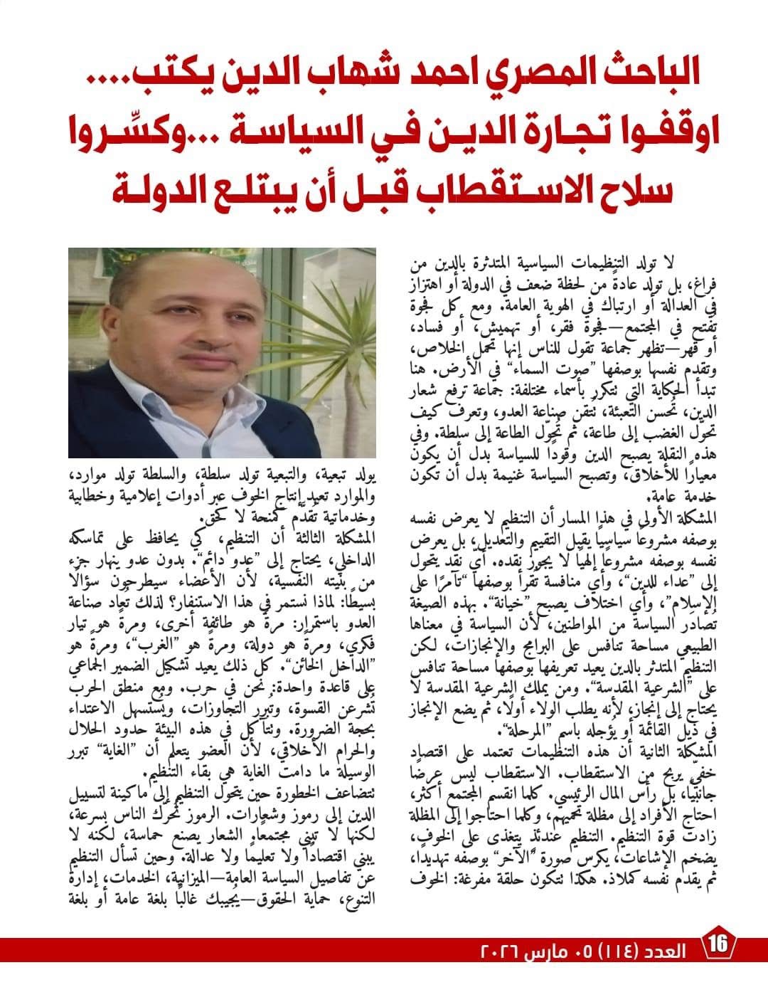 وفي سياق متصل، يخصص أحد مقالات العدد مساحة لتفكيك توظيف الدين في السياسة، موضحاً أن التنظيم المتدثر بالدين يقدّم نفسه بوصفه مشروعاً مقدساً لا يجوز نقده، ويحوّل المنافسة السياسية من تنافس على البرامج إلى تنافس على “الشرعية المقدسة”. ويربط المقال بين الاستقطاب وبين ما يسميه اقتصاد الخوف وصناعة العدو الدائم، قبل أن يطرح مساراً للخروج يقوم على دولة القانون، وتحييد المقدس عن الغنيمة السلطوية، وتجفيف منابع الاستقطاب عبر ضمان الحقوق بوصفها حقوقاً لا “منحاً” من الجماعات.