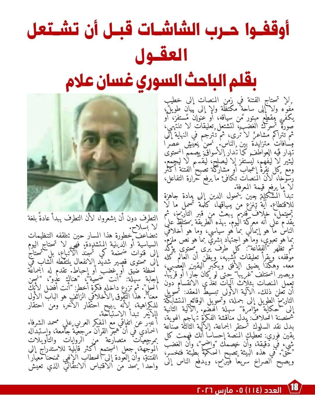 كما يتناول محور آخر من العدد ما وصفه بفتنة المنصات الرقمية وحروب الشاشات، موضحاً أن الفتنة لم تعد تحتاج خطيباً مفوهاً أو بياناً طويلاً؛ إذ يكفي مقطع مبتور أو عنوان مستفز لإشعال موجات غضب تصنع يقيناً عصبيًا وتدفع نحو التحريض. وينبه المقال إلى آليات المنصات في تبسيط المعقد وشخصنة الخلاف وصناعة يقين فوري، داعياً إلى بناء “مناعة رقمية” تقوم على التحقق وفهم السياق والتمييز بين النص والتأويل، وبين النقد والتحريض.