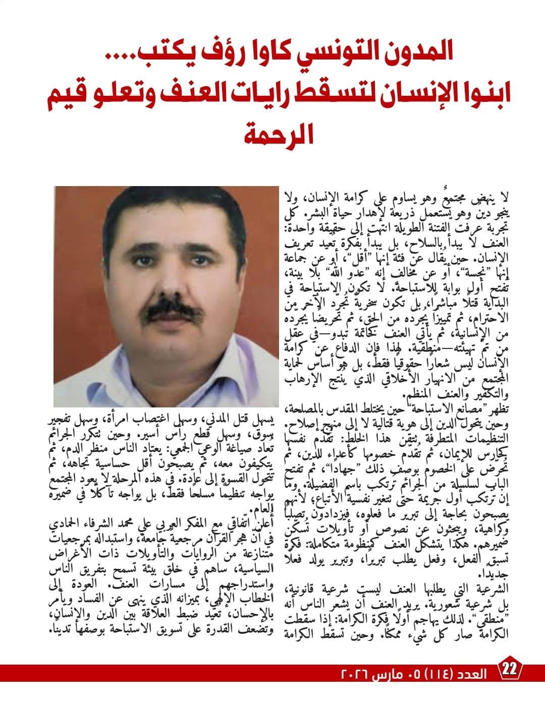 ويطرح مقال آخر سؤال الكرامة الإنسانية بوصفه معياراً كاشفاً لزيف التدين العنيف، مؤكداً أن العنف يبدأ بفكرة تنزع عن الضحية إنسانيتها قبل أن يبدأ بالسلاح. ويربط المقال بين حماية الحق في الحياة وبين تجفيف منابع التجنيد، موضحاً أن التنظيمات المتطرفة تعيش على مظلومية تتغذى من غياب العدالة وتعميم الاتهام والعقاب الجماعي، ليخلص إلى أن وضع كرامة الإنسان في المركز يسقط شرعية الاستباحة مهما تزينت بالشعارات.
