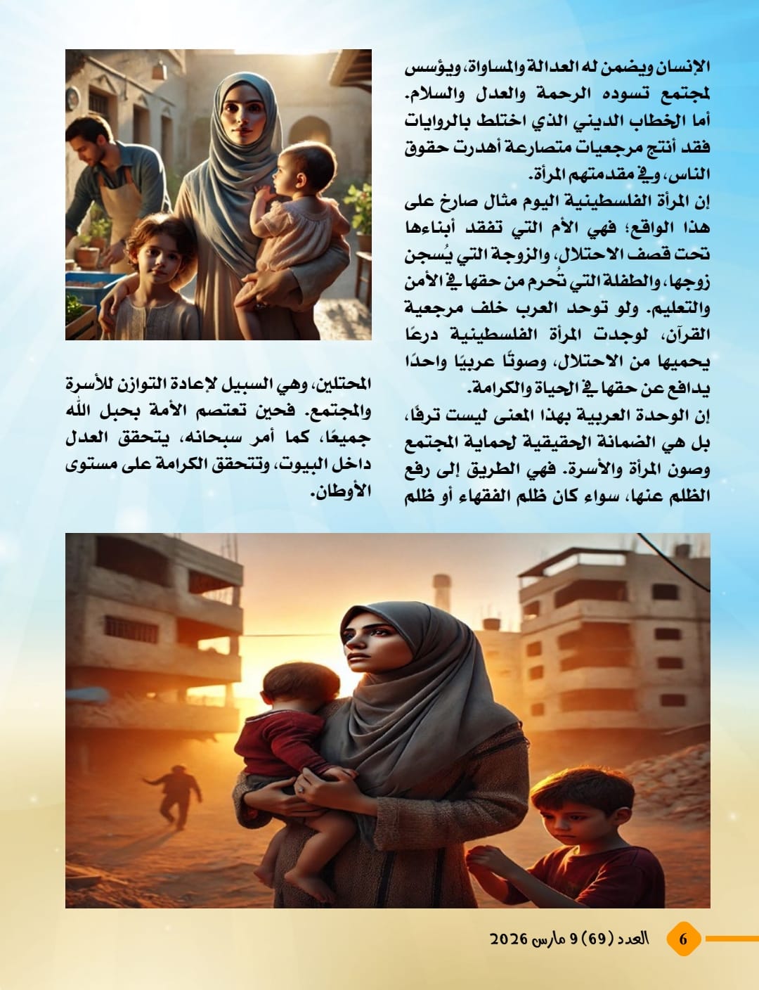 ويتضمن العدد كذلك افتتاحية تؤكد أن المرأة العربية، ولا سيما الفلسطينية، دفعت ثمن مضاعف بين تحديات داخلية ناتجة عن بعض التشريعات والاجتهادات، وتحديات خارجية فرضتها ظروف الاحتلال وتشدد الافتتاحية على أن وحدة الأمة والعودة إلى القرآن الكريم كمرجعية أساسية تمثلان ضمانة لحماية المرأة وصون كرامتها وتعزيز مكانتها في المجتمع.