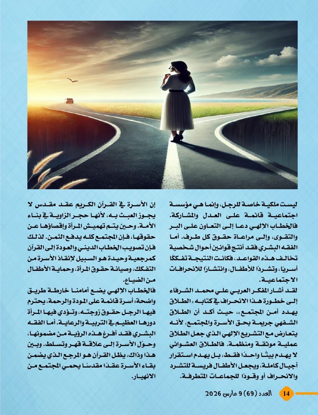 ويتوسع الملف في مناقشة أثر بعض التفسيرات الفقهية على بنية الأسرة من خلال موضوع بعنوان «الأسرة بين قدسية القرآن وتشويه الفقه الذكوري»، موضحًا أن القرآن أقام العلاقة الأسرية على المودة والرحمة والسكن، بينما أسهمت بعض الاجتهادات المنحرفة عن هذا النهج في إضعاف تلك القيم. كما يتناول العدد موضوعًا آخر بعنوان «المرأة العربية.. الحارس الأخير للأسرة في زمن الحروب»، مسلطًا الضوء على دور المرأة في الحفاظ على تماسك الأسرة العربية في ظل الصراعات والتهجير وفقدان الاستقرار.