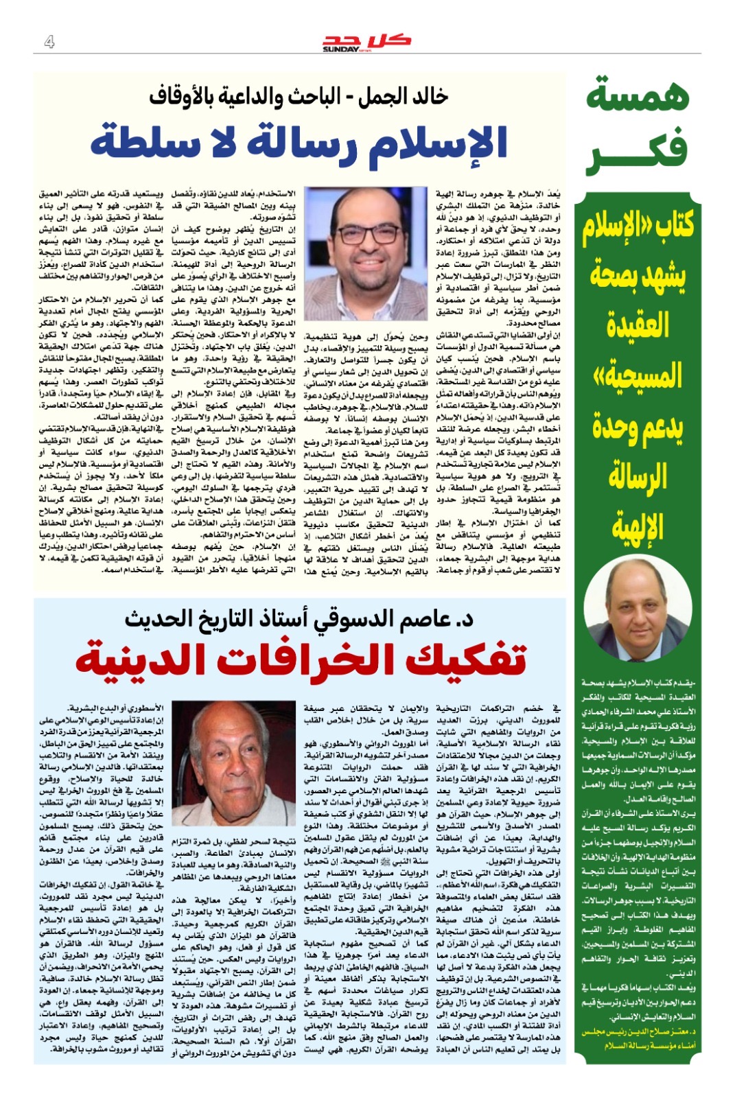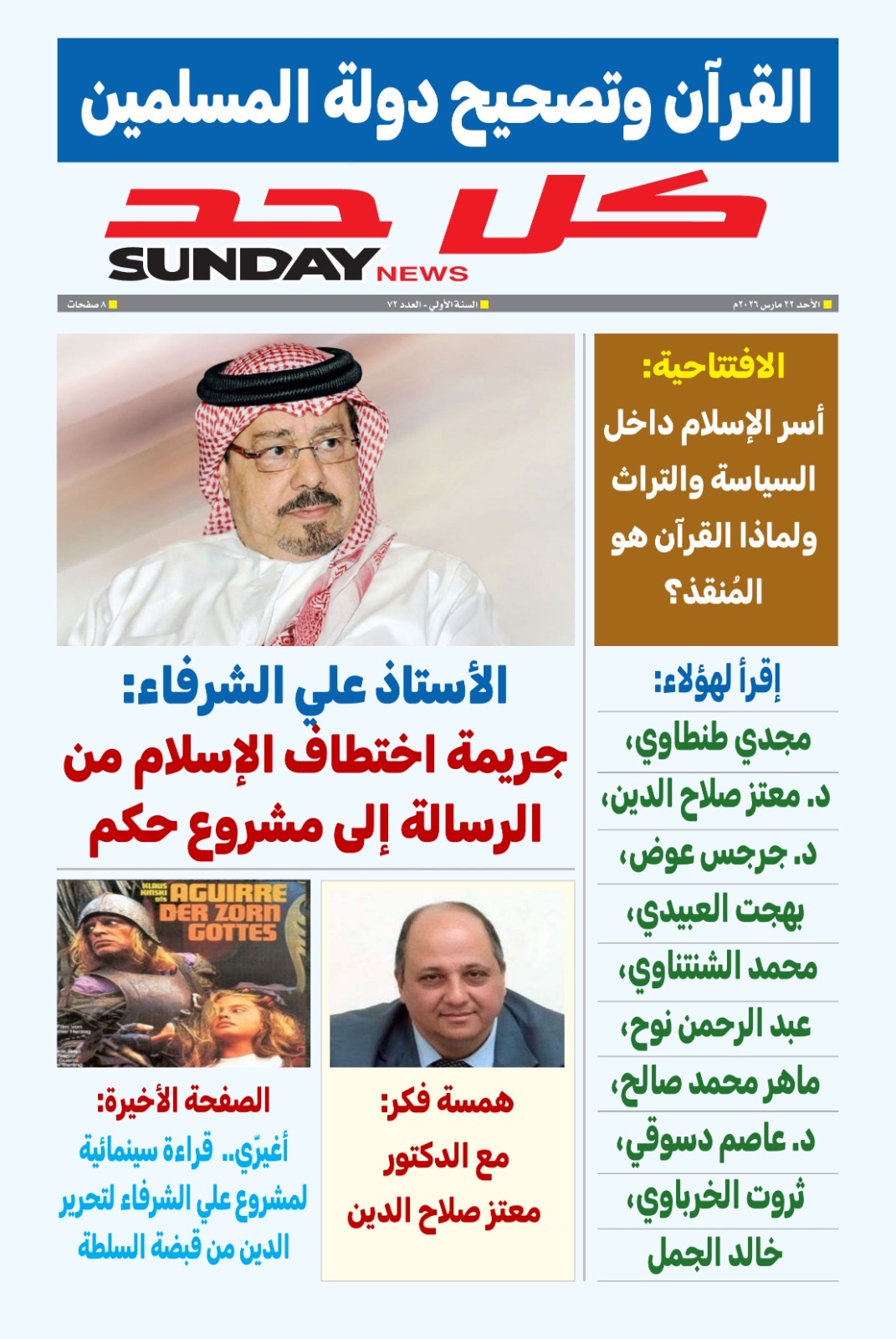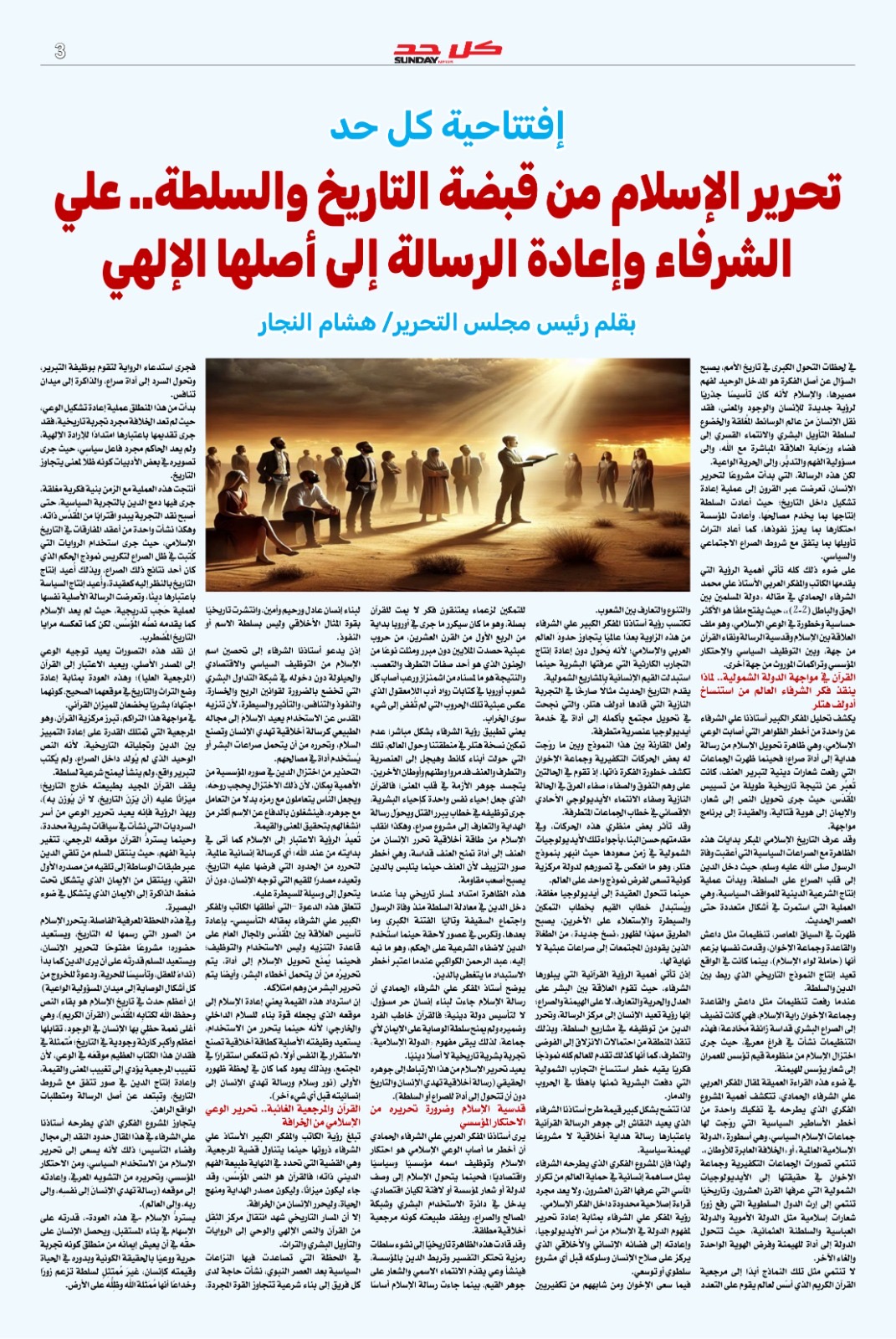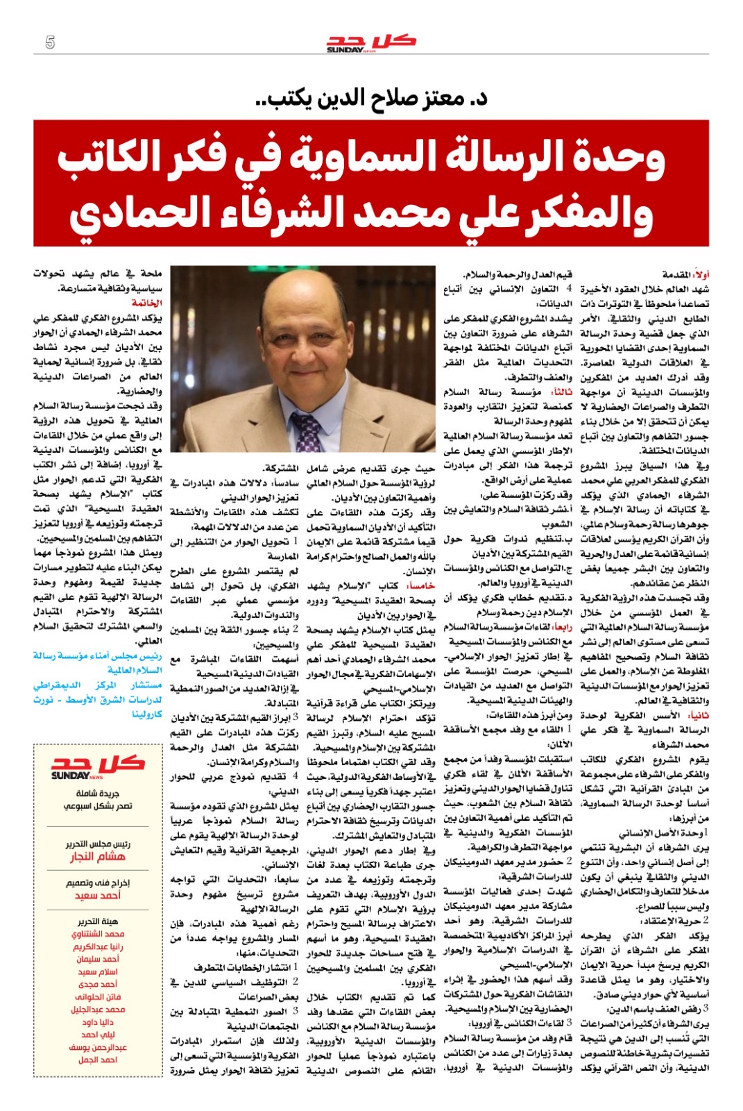 وفى ملف العدد وبالافتتاحية مقال تحليلي لرئيس مجلس تحرير المجلة الكاتب الصحفي هشام النجار بعنوان (تحرير الإسلام من قبضة التاريخ والسلطة .. علي الشرفاء وإعادة الرسالة إلى أصلها الإلهي)