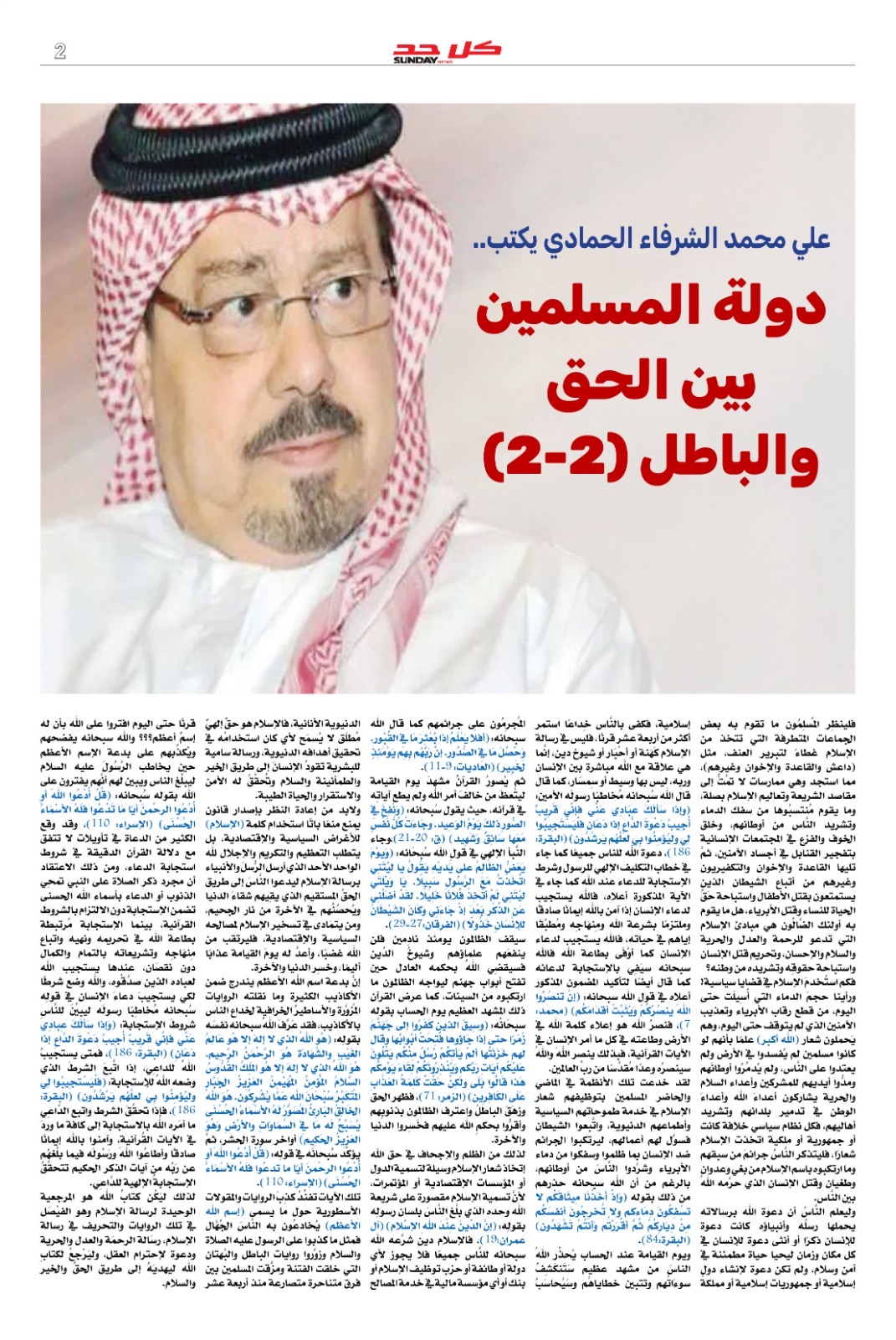 تصدر العدد مقال المفكر العربي الكبير الأستاذ علي محمد الشرفاء الحمادي بعنوان (دولة المسلمين بين الحق والباطل ٢-٢) ، وهو الجزء الثاني من فصل (دولة المسلمين بين الحق والباطل) بكتاب الأستاذ الشرفاء التأسيسي والمهم ( ومضات على الطريق ج٨)