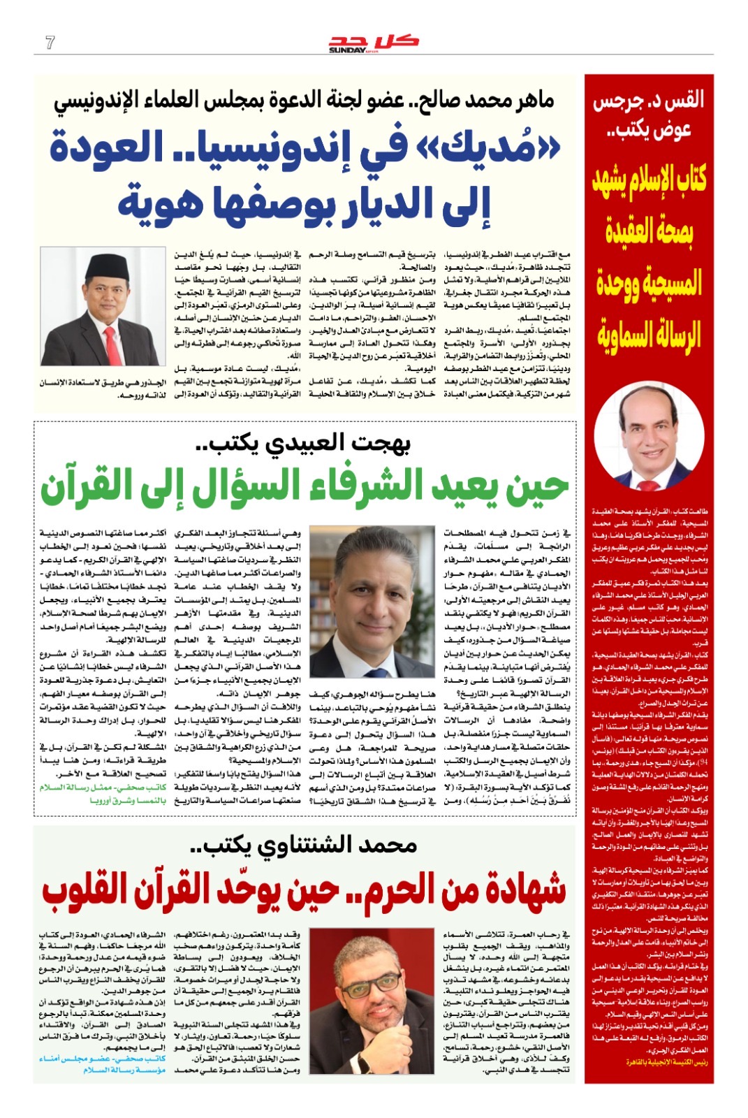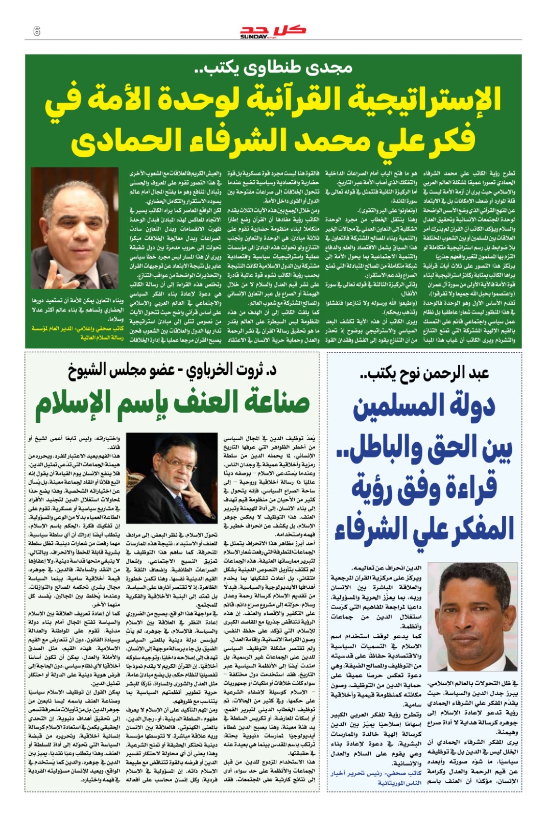وفى العدد مقال للمدير العام لمؤسسة رسالة السلام العالمية الكاتب الصحفي والإعلامي الأستاذ مجدي طنطاوي بعنوان (الإستراتيجية القرآنية لوحدة الأمة في فكر علي محمد الشرفاء)