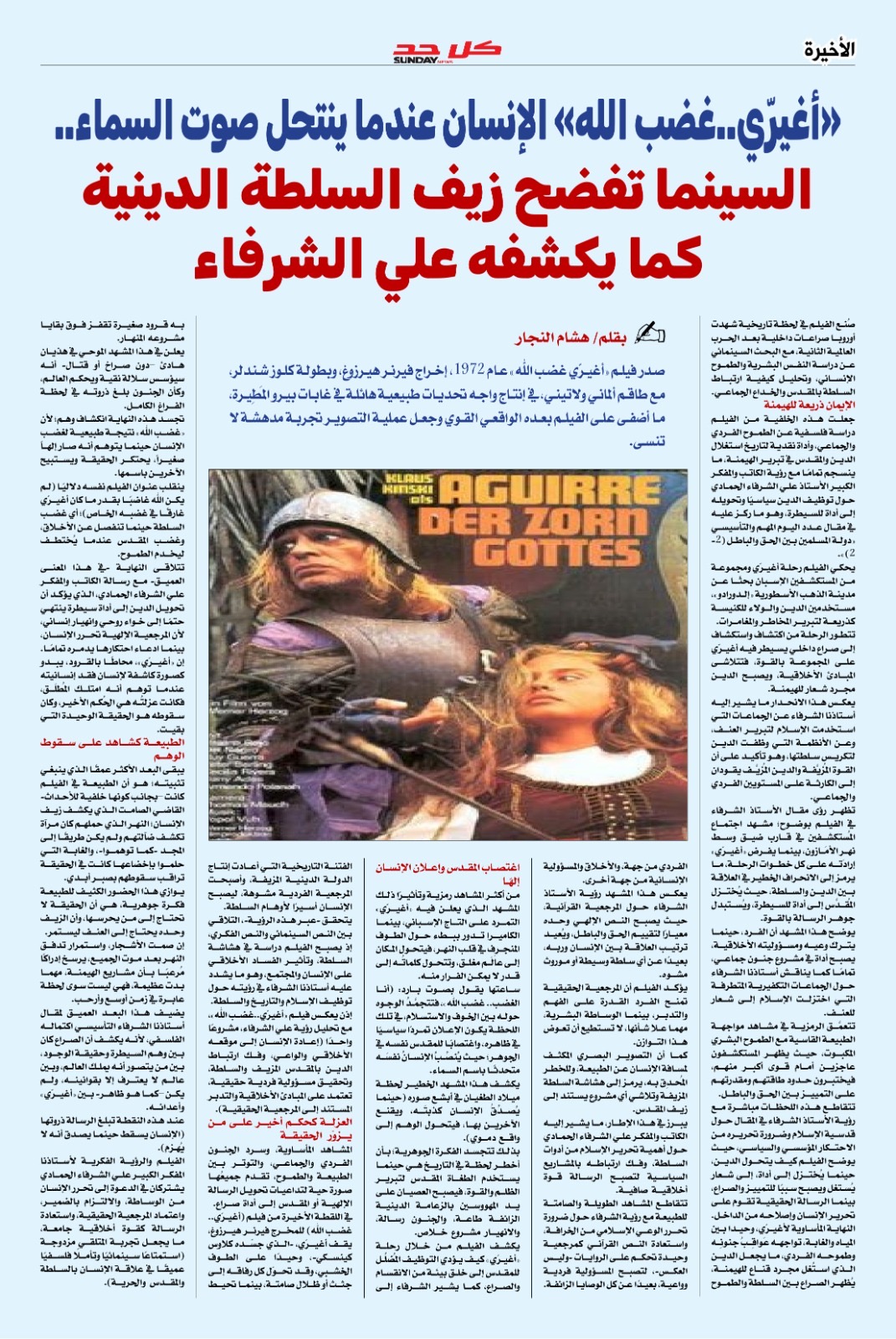 بالصفحة الأخيرة التي تشتبك مع المشهد الفني والثقافي مقال تحليلي ونقدي لرئيس مجلس تحرير المجلة الكاتب الصحفي والأديب هشام النجار بعنوان (أغيري.. غضب الرب .. الإنسان عندما ينتحل صوت السماء .. السينما تفضح زيف السلطة الدينية كما يكشفه الشرفاء) .