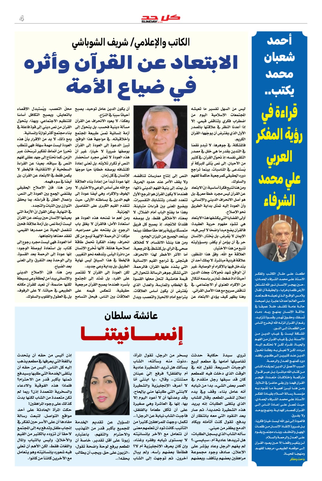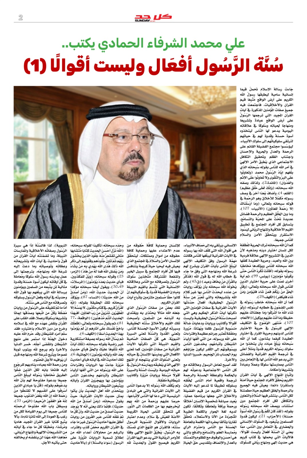 تصدر العدد مقال الكاتب والمفكر الكبير الأستاذ علي محمد الشرفاء الحمادي بعنوان "سنة الرسول أفعال وليست أقوالا (١)"
