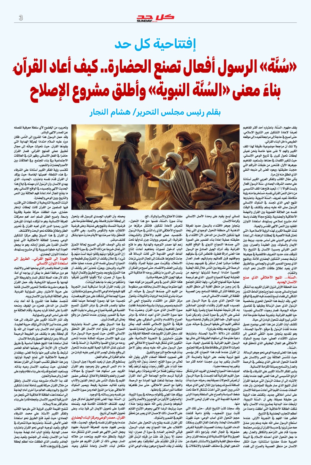 داخل ملف العدد وبالافتتاحية مقال تحليلي لرئيس مجلس تحرير المجلة بعنوان (سنة الرسول أفعال تصنع الحضارة.. كيف أعاد القرآن بناء معنى السنة النبوية وأطلق مشروع الإصلاح)