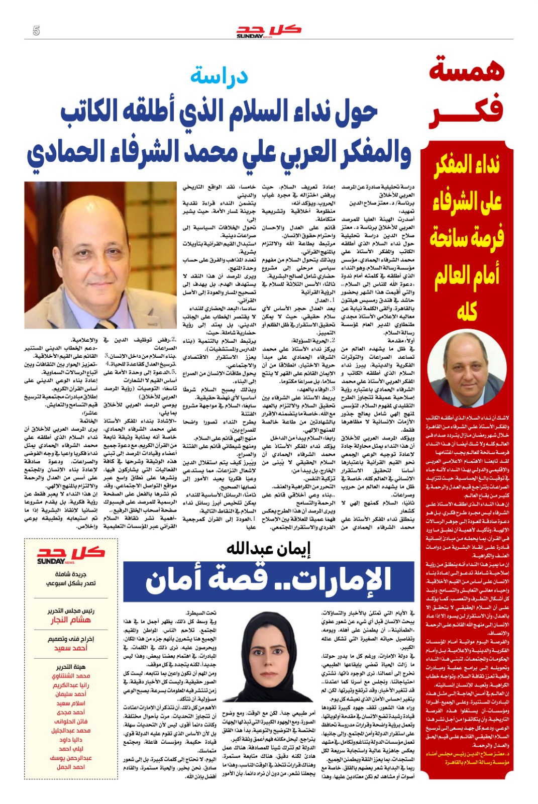 كما يتضمن العدد دراسة بعنوان (حول نداء السلام الذي أطلقه الكاتب والمفكر العربي على محمد الشرفاء الحمادي) أعدها المرصد العربي للأخلاق برئاسة الدكتور معتز صلاح الدين رئيس المرصد ورئيس مجلس أمناء مؤسسة رسالة السلام العالمية