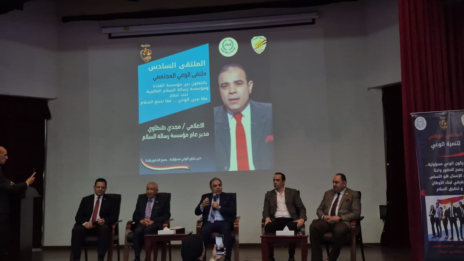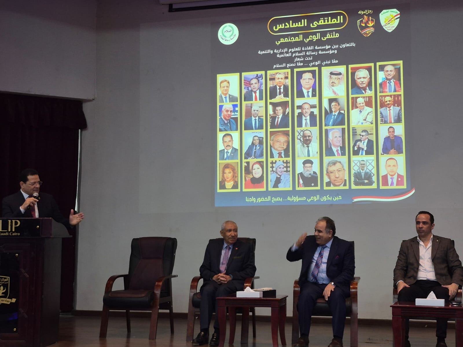 جاء ذلك فعاليات الملتقى الوطني السادس والذي تنظمه مؤسسة رسالة السلام، بالتعاون مع مؤسسة القادة للعلوم الإدارية والتنمية، بعنوان : “ الوعي المجتمعي وبناء الإنسان.. معًا نبني الوعي، معًا نصنع السلام”، لدعم جهود فخامة الرئيس عبد الفتاح السيسي وتأييداً لجهود الدولة المصرية في خطوة تهدف إلى تعزيز ثقافة الوعي المجتمعي وأهمية بناء الإنسان في إطار مشروع السلام والتنمية المستدامة وذلك بحضور الكاتب الصحفي مجدي طنطاوي مدير عام المؤسسة والدكتور معتز صلاح الدين رئيس مجلس الامناء بالقاهرة والدكتور عيد الراضي رضوان نائب رئيس مؤسسة رسالة السلام بالقاهرة والكاتب الصحفي خالد العوامي نائب رئيس مؤسسة رسالة السلام لشئون الصحافة والإعلام والمتابعة والدكتور جرجس عوض الامين العام بالقاهرة والدكتور احمد الشريف رئيس مجلس امناء مؤسسة القادة والدكتور محمد ابو زيد نائب رئيس مجلس امناء القادة والدكتور محمد غيدة امين عام مؤسسة القادة .
