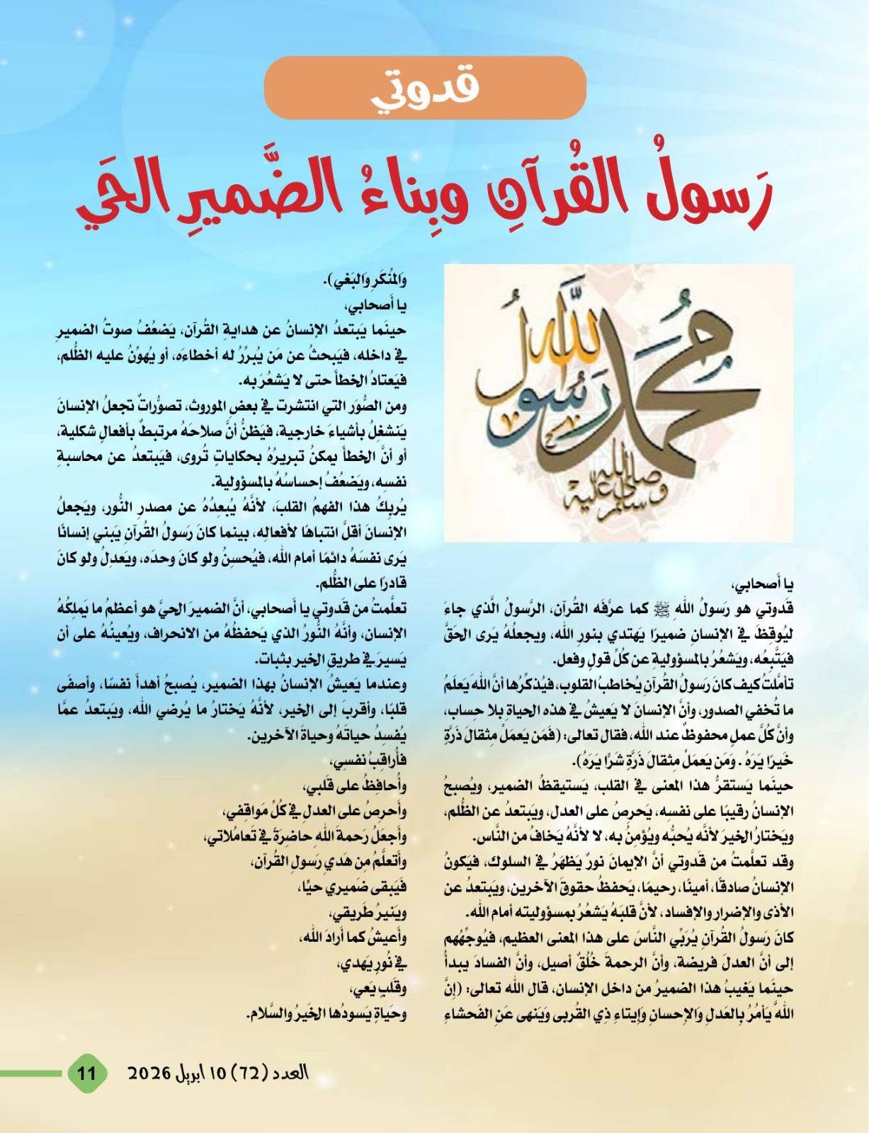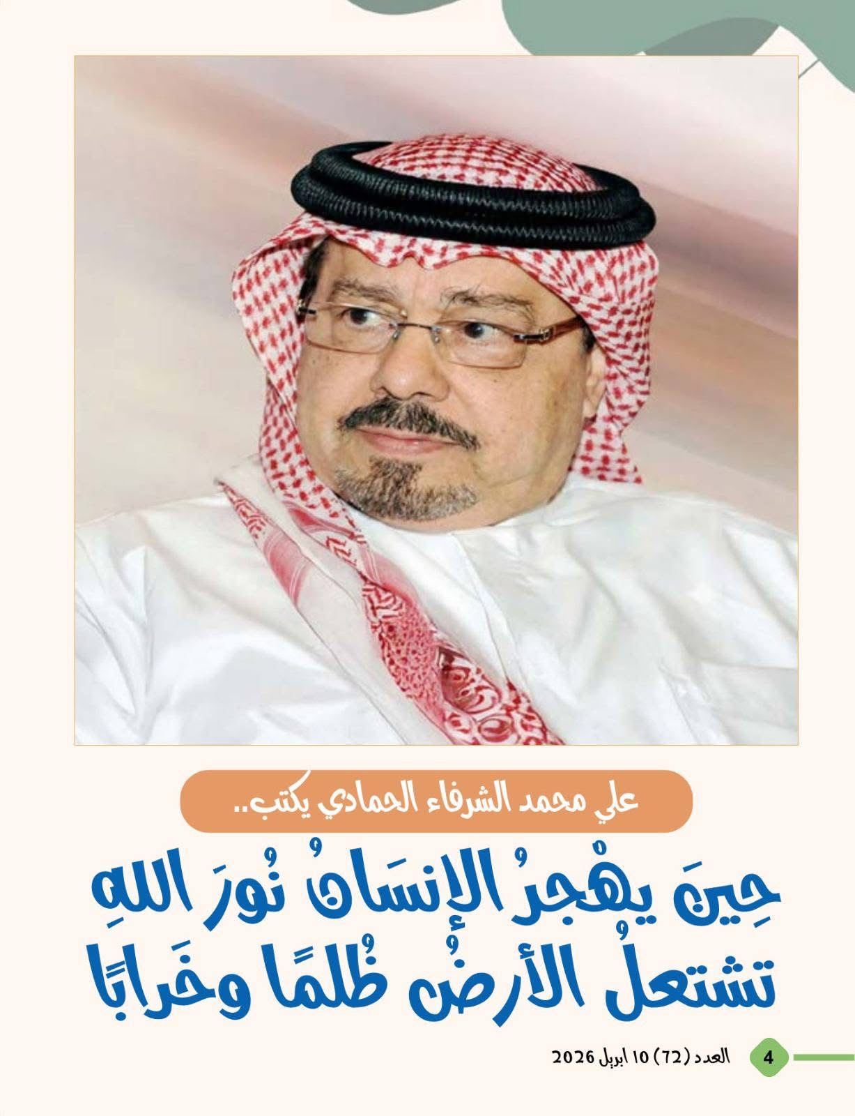 تصدر العدد مقال الكاتب والمفكر الأستاذ علي محمد الشرفاء الحمادي بعنوان (حين يهجر الإنسان نور الله تشتعل الأرض ظلما وخرابا) وتناولت فقرة أسماء الله الحسنى إسم الله المحيط .