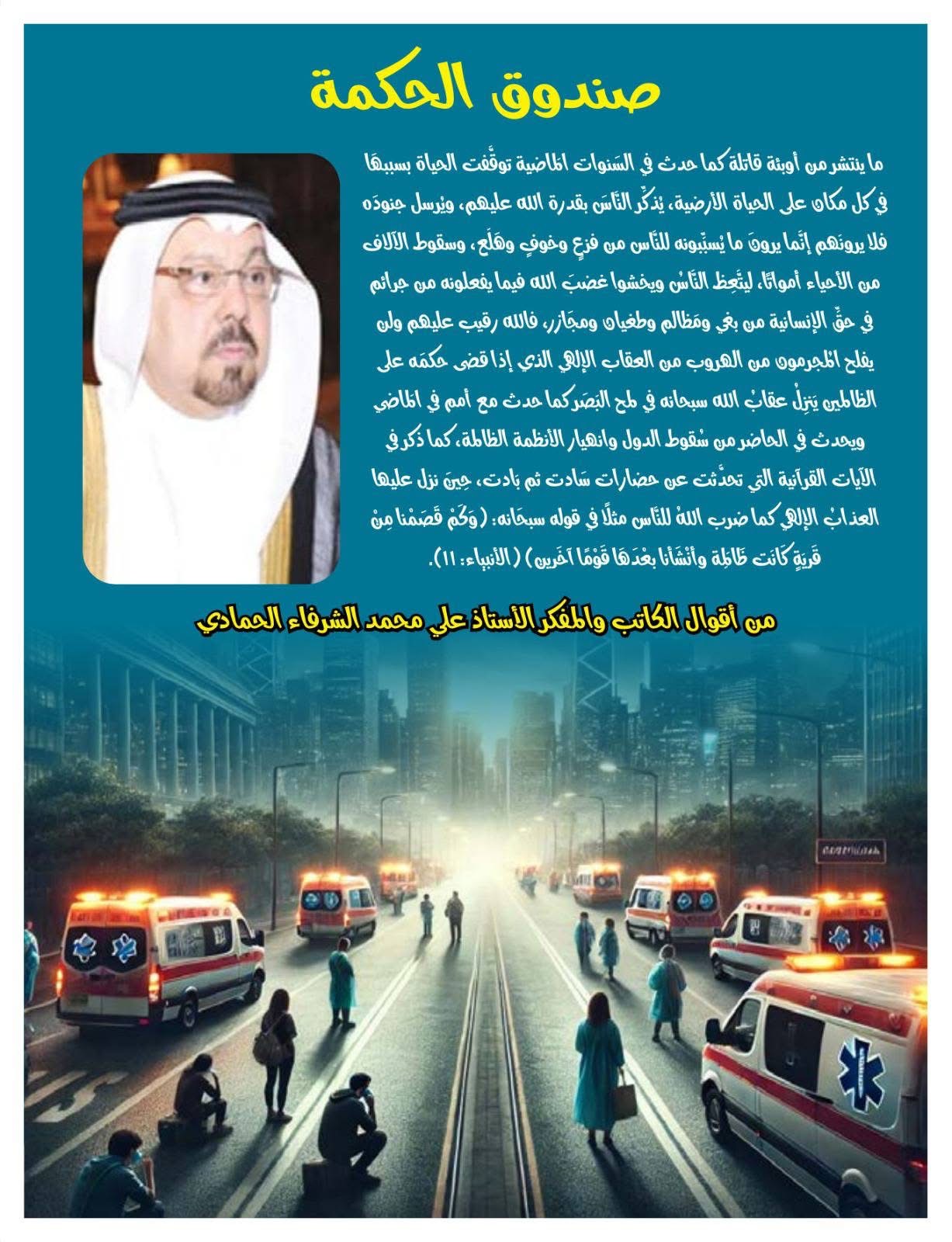 بفقرة صندوق الحكمة مقولة ملهمة من أقوال الكاتب والمفكر الكبير الأستاذ علي محمد الشرفاء الحمادي