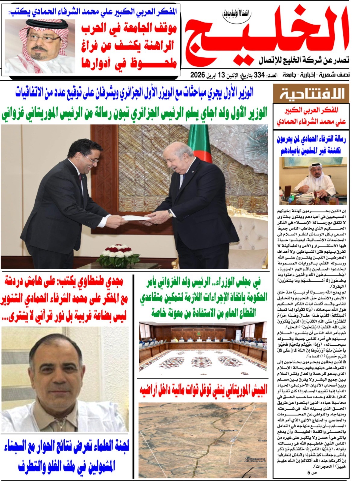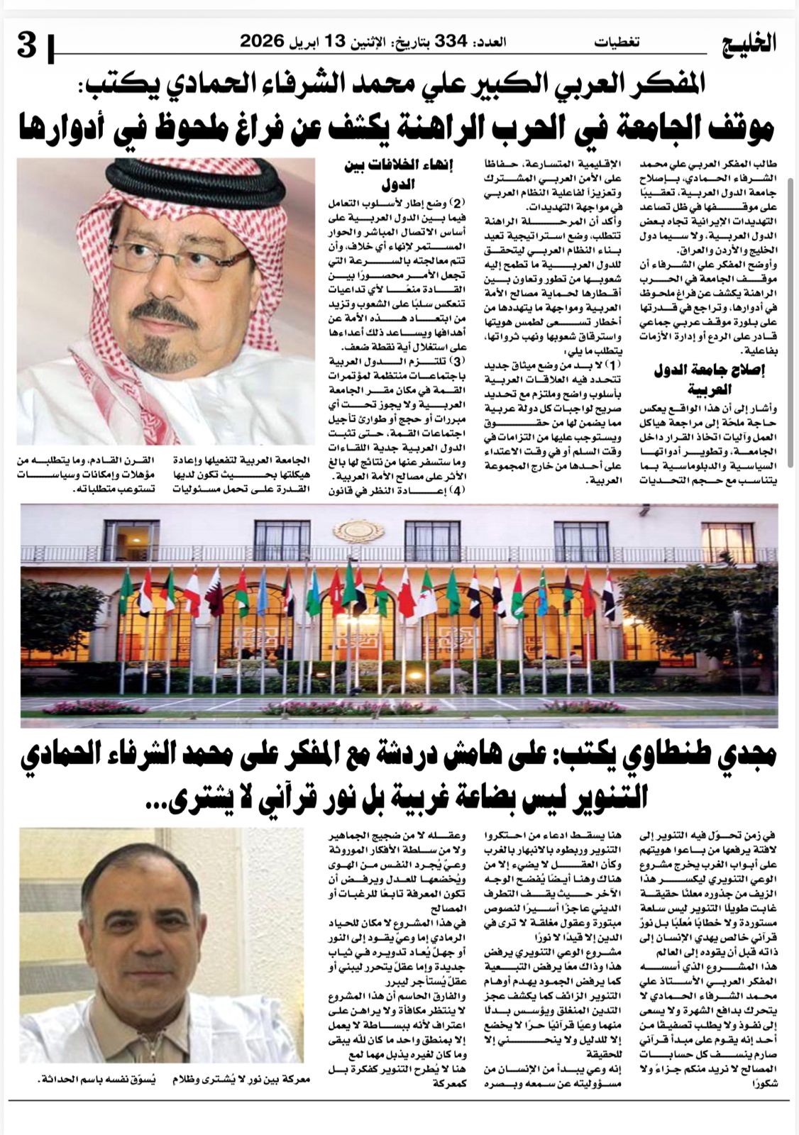 وتصدر غلاف العدد مقال للمفكر العربي الكبير علي محمد الشرفاء الحمادي، بعنوان: “موقف الجامعة في الحرب الراهنة يكشف عن فراغ ملحوظ في أدوارها”، حيث تناول فيه قراءة نقدية للمشهد الراهن، ودور المؤسسات الفكرية والدينية في التعامل مع الأزمات والتحديات.