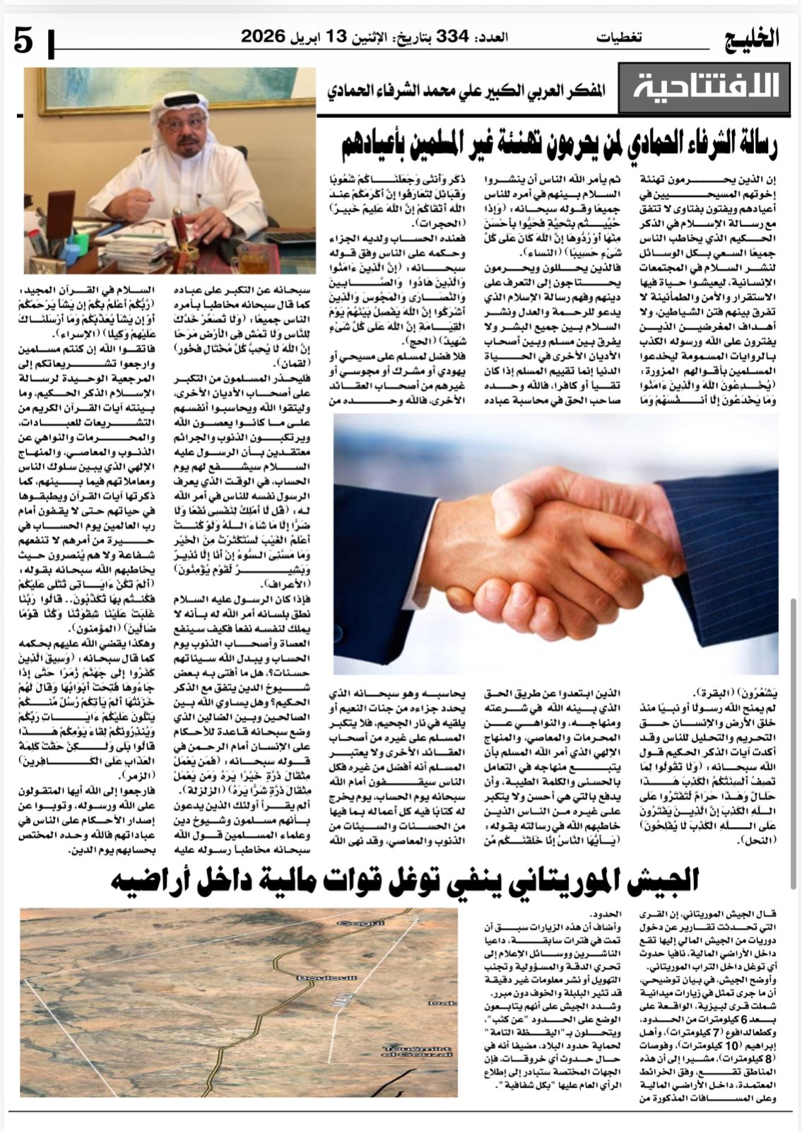 كما تضمنت افتتاحية العدد طرحًا مهمًا حول رسالة الشرفاء الحمادي بشأن موقف بعض التيارات من تهنئة غير المسلمين بأعيادهم، في سياق دعوة واضحة إلى ترسيخ قيم التسامح، واحترام التنوع، وتغليب روح التعايش الإنساني.