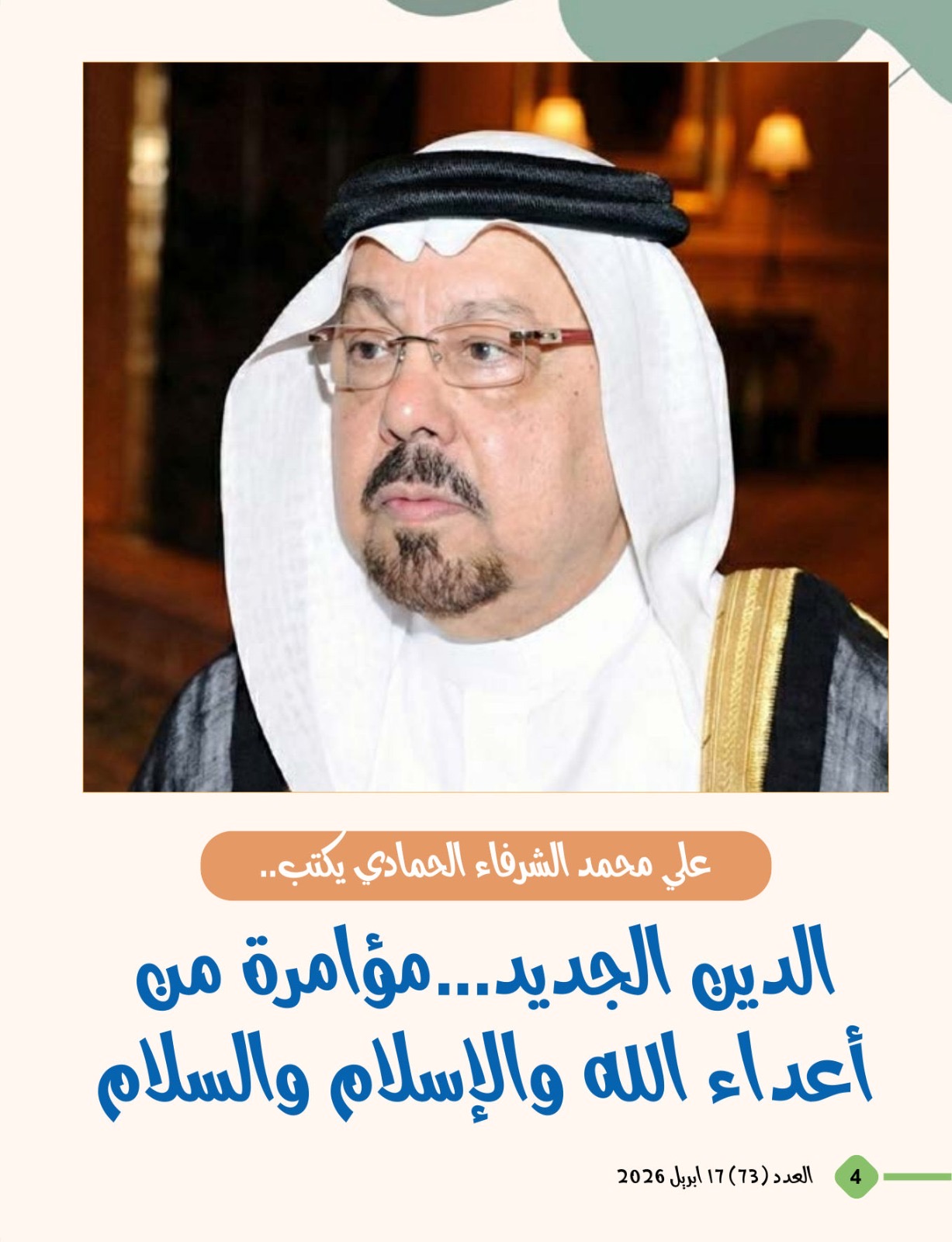 تصدر العدد مقال الكاتب والمفكر الكبير الأستاذ علي محمد الشرفاء الحمادي بعنوان (الدين الجديد.. مؤامرة من أعداءالله والإسلام والسلام)