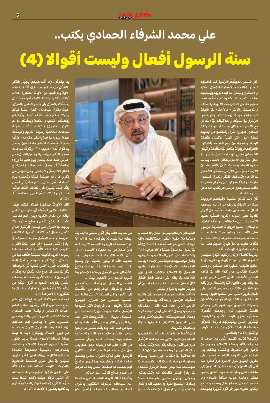 إذ صدر اليوم الأحد ١٩ أبريل ٢٠٢٦م العدد ٧٦ من مجلة (كل حد) التي تصدر عن مؤسسة رسالة السلام العالمية ، ناقش العدد ملفا رئيسيا بعنوان (القرآن وحده.. المنهج والنجاة) ، وتصدر العدد مقال الكاتب والمفكر العربي الكبير الأستاذ علي محمد الشرفاء الحمادي بعنوان (سنة الرسول أفعال وليست أقوالا ٤)