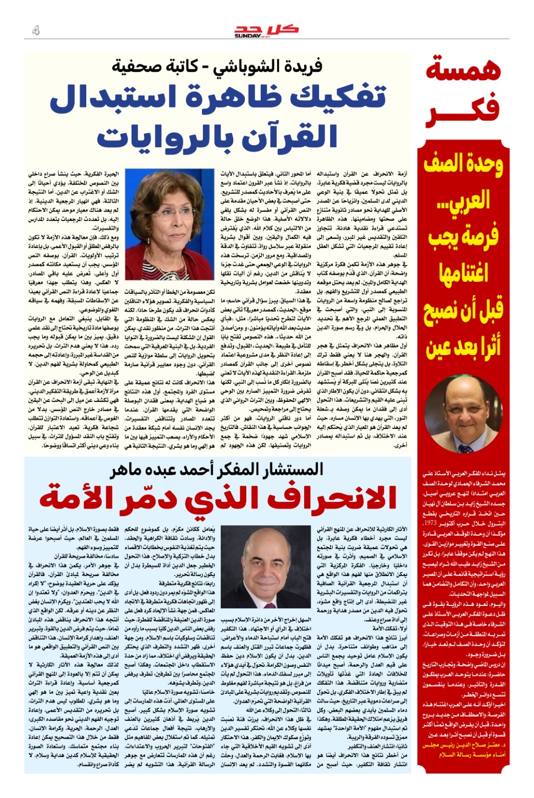 داخل ملف العدد مقالات لكل من: الكاتبة الصحفية فريدة الشوباشي، والمفكر أحمد عبده ماهر ، وأستاذ الفلسفة الدكتور كرم عباس