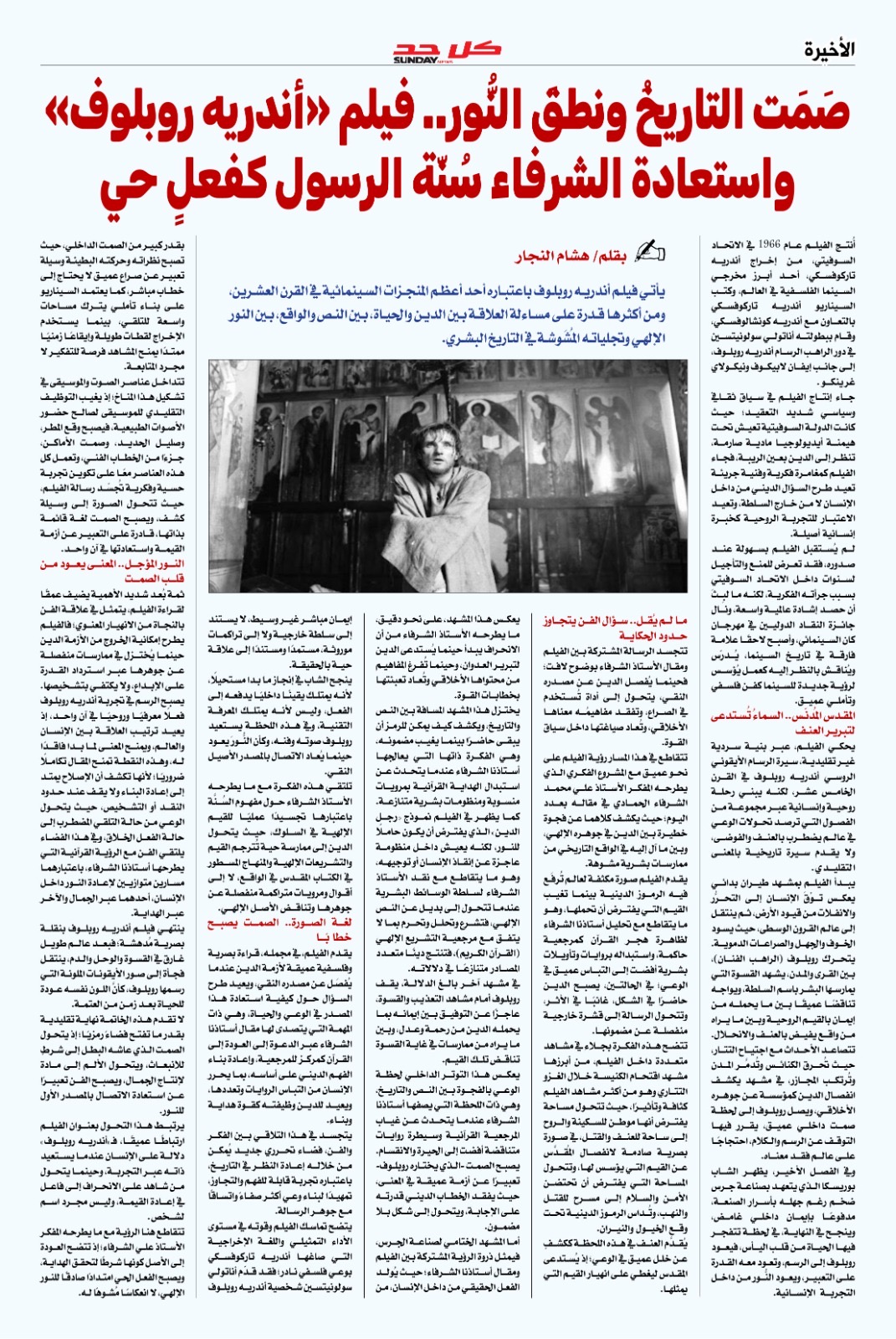 بالصفحة الأخيرة التي تشتبك مع المشهدين الفني والثقافي مقال تحليلي ونقدي لرئيس مجلس تحرير المجلة الكاتب الصحفي والأديب هشام النجار بعنوان (صمت التاريخ ونطق النور.. فيلم أندريه ربوبلوف واستعادة الشرفاء سنة الرسول كفعل حي) .