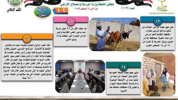 أصدر مركز المعلومات الصوتية والمرئية، التابع لوزارة الزراعة واستصلاح الاراضي، "الانفوجراف الأسبوعي" في نسخته رقم ١٠٣ ، حول الحصاد الأسبوعي لأهم أنشطة الوزارة، خلال الأسبوع الماضي في الفترة من ٤ وحتى ١١ أغسطس الجاري، وذلك بالتعاون مع المكتب الإعلامي للوزارة، كما أصدر المركز أيضا ملخصا بالفيديو، حول أنشطة