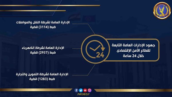 إضطلعت أجهزة وزارة الداخلية بالإدارات العامة التابعة لقطاع الأمن الإقتصادى، بتكثيف الحملات الأمنية بالتنسيق مع كافة الجهات المعنية خلال الفترة الأخيرة فى مجال أعمال تلك الإدارات. حيث أسفرت جهودها خلال 24 ساعة عن تحقيق العديد من النتائج الإيجابية، من بينها الآتى: الإدارة العامة لشرطة النقل والمواصلات