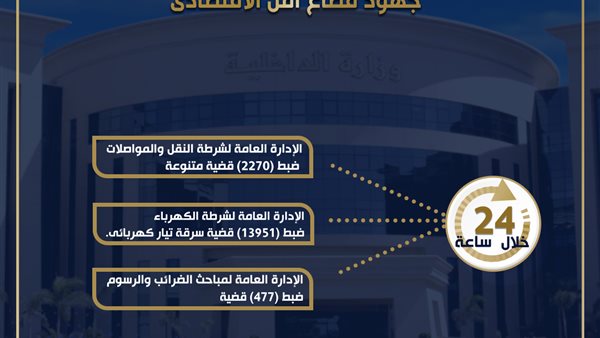 أسفرت جهود الإدارات العامة التابعة لقطاع أمن المنافذ بوزارة الداخلية بالتنسيق مع كافة الجهات المعنية خلال 24 ساعة عن تحقيق العديد من النتائج الإيجابية .. أبرزها الآتى:- فى مجال مكافحة جرائم تهريب البضائع عبر المنافذ الجمركية: ضبط عدد (6) قضايا. فى مجال ضبط المخالفات المرورية: ضبط عدد (1773) مخالفة