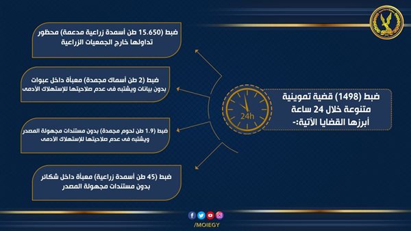 واصلت الإدارة العامة لشرطة التموين والتجارة بالتنسيق مع إدارات وأقسام شرطة التموين وفروعها الجغرافية بمديريات الأمن وقطاع الأمن العام، حملاتها التموينية المكبرة لضبط الجرائم التموينية أسفرت عن ضبط 1253 قضية تموينية متنوعة من بينهم ضبط (417) قضية بيع بأزيد من السعر وعدم الإعلان عن الأسعار بإجمالى مضبوطات