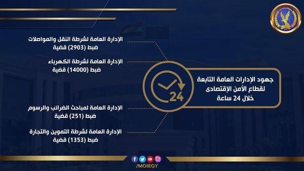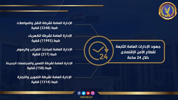 إضطلعت أجهزة الوزارة بالإدارات العامة التابعة لقطاع الأمن الإقتصادى، بتكثيف الحملات الأمنية بالتنسيق مع كافة الجهات المعنية خلال الفترة الأخيرة فى مجال أعمال تلك الإدارات.. حيث أسفرت جهودها خلال 24 ساعة عن تحقيق العديد من النتائج الإيجابية، من بينها الآتى: الإدارة العامة لشرطة النقل والمواصلات قامت