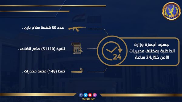 قامت أجهزة وزارة الداخلية بمختلف مديريات الأمن على مستوى الجمهورية بتوجيه حملة أمنية مكبرة. أسفرت جهودها خلال 24 ساعة عن تحقيق النتائج الإيجابية التالية:-