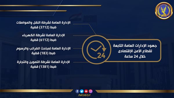 إضطلعت أجهزة الوزارة بالإدارات العامة التابعة لقطاع الأمن الإقتصادى، بتكثيف الحملات الأمنية بالتنسيق مع كافة الجهات المعنية خلال الفترة الأخيرة فى مجال أعمال تلك الإدارات.. حيث أسفرت جهودها خلال 24 ساعة عن تحقيق العديد من النتائج الإيجابية، من بينها الآتى: الإدارة العامة لشرطة النقل والمواصلات قامت