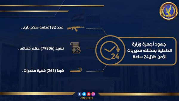 قامت أجهزة وزارة الداخلية بمختلف مديريات الأمن على مستوى الجمهورية بتوجيه حملة أمنية مكبرة أسفرت جهودها خلال24 ساعة