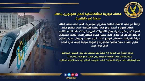 تقوم الإدارة العامة لمرور القاهرة بتعيين الخدمات المرورية اللازمة لمواجهة أى كثافات مرورية متوقعة وتسيير حركة المرور وذلك تزامناً مع تنفيذ الأعمال الخاصة