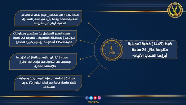أسفرت جهود الإدارات العامة التابعة لقطاع أمن المنافذ بوزارة الداخلية بالتنسيق مع كافة الجهات المعنية خلال 24 ساعة عن تحقيق العديد من النتائج الإيجابية.. أبرزها الآتى:- فى مجال مكافحة جرائم تهريب البضائع عبر المنافذ الجمركية : ضبط (4) قضايا. فى مجال الأمن العام: ضبط عدد (25) قضية . فى مجال ضبط المخالفات