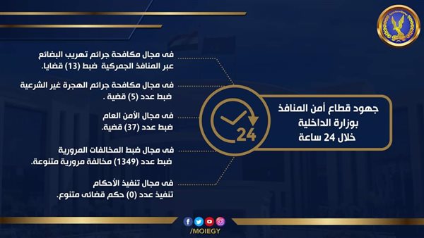 أسفرت جهود الإدارات العامة التابعة لقطاع أمن المنافذ بوزارة الداخلية بالتنسيق مع كافة الجهات المعنية خلال 24 ساعة عن تحقيق العديد من النتائج الإيجابية. أبرزها الآتى:- فى مجال مكافحة جرائم تهريب البضائع عبر المنافذ الجمركية : ضبط (2) قضية. فى مجال مكافحة جرائم تهريب وحيازة المواد والأقراص الدوائية