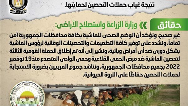 انتشر في بعض المواقع الإلكترونية وصفحات التواصل الاجتماعي أنباء بشأن انتشار مرض الحمى القلاعية بين الماشية في مصر نتيجة غياب حملات التحصين لحمايتها، وقد قام المركز الإعلامي لمجلس الوزراء بالتواصل مع وزارة الزراعة واستصلاح الأراضي، والتي نفت تلك الأنباء، مُؤكدةً أنه لا صحة لانتشار مرض الحمى القلاعية
