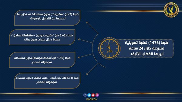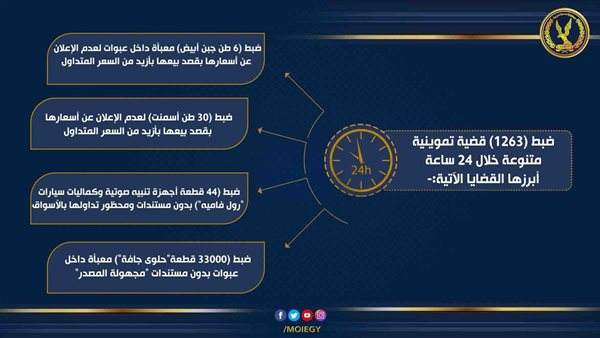 واصلت الإدارة العامة لشرطة التموين والتجارة بالتنسيق مع إدارات وأقسام #شرطة_التموين وفروعها الجغرافية بمديريات الأمن وقطاع الأمن العام، حملاتها التموينية المكبرة لضبط الجرائم التموينية أسفرت عن ضبط 1567 قضية تموينية متنوعة من بينهم 3 قضايا حجب سلع غذائية بإجمالى مضبوطات (11٫250 طن "دقيق أبيض – أرز-